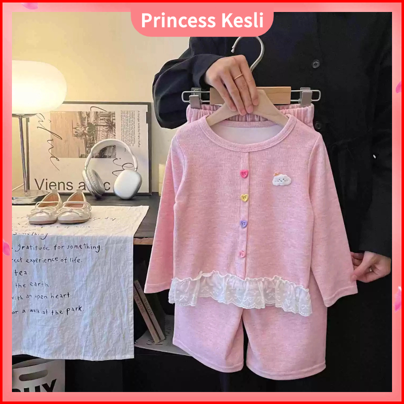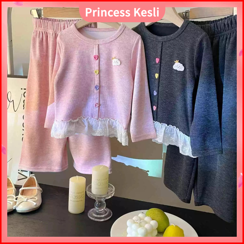 Princess Kesli Store 2-11 Tahun Setelan Anak Perempuan Modis Musim Semi Baru 2025 Atasan Bulu Beras Ketan Renda Celana S