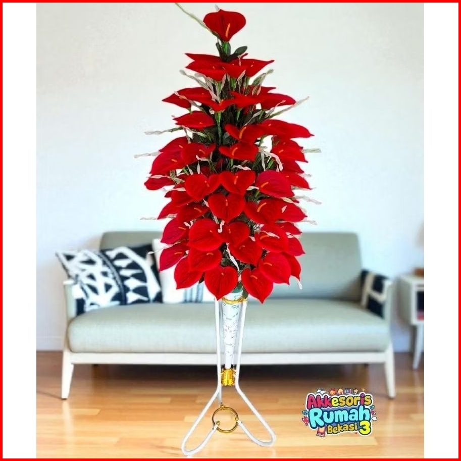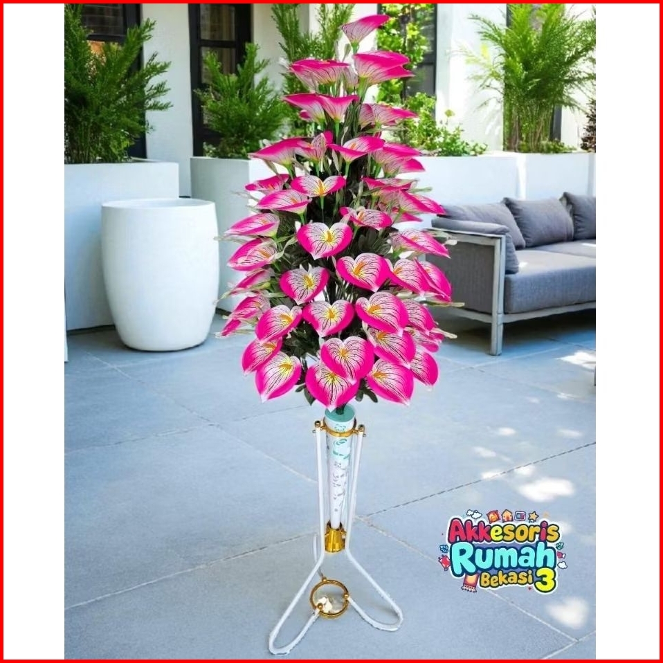 Hiasan Rumah Bunga Anthurium Lily Artificial 60 Kuntum Dengan Pot Standing Besi