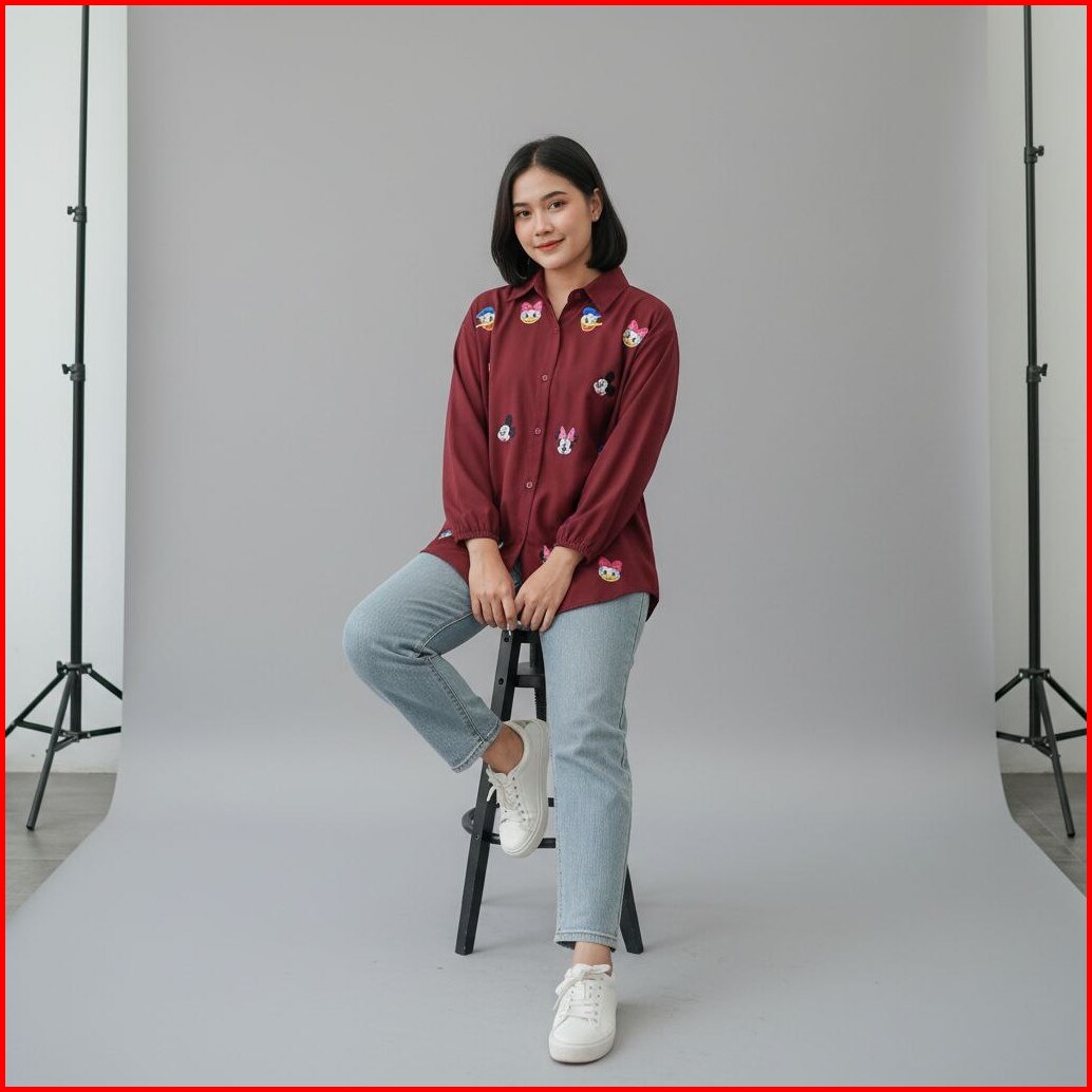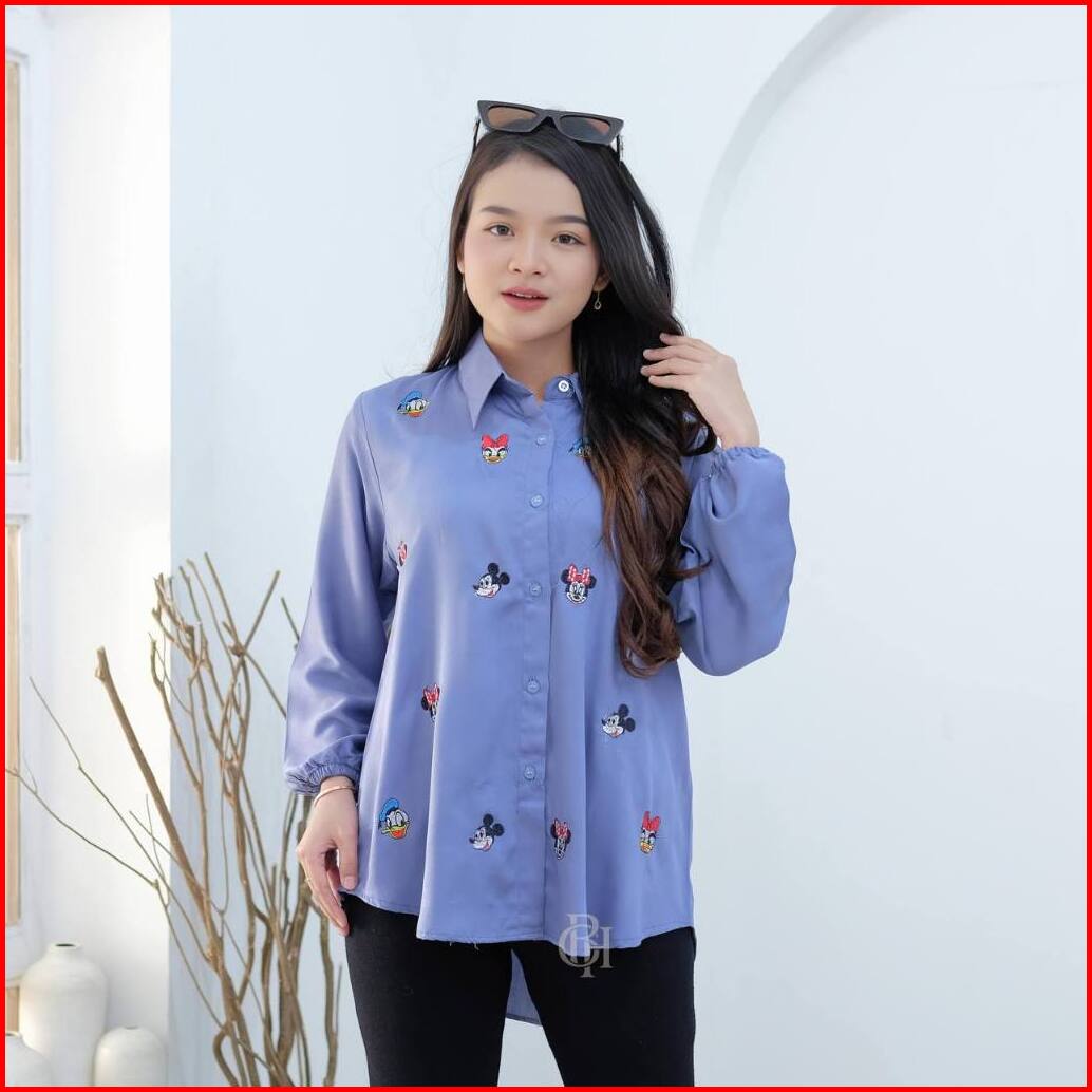 Kemeja Blouse Dena Atasan Wanita Bordir Polos Rayon Twill Lengan Panjang Kekinian