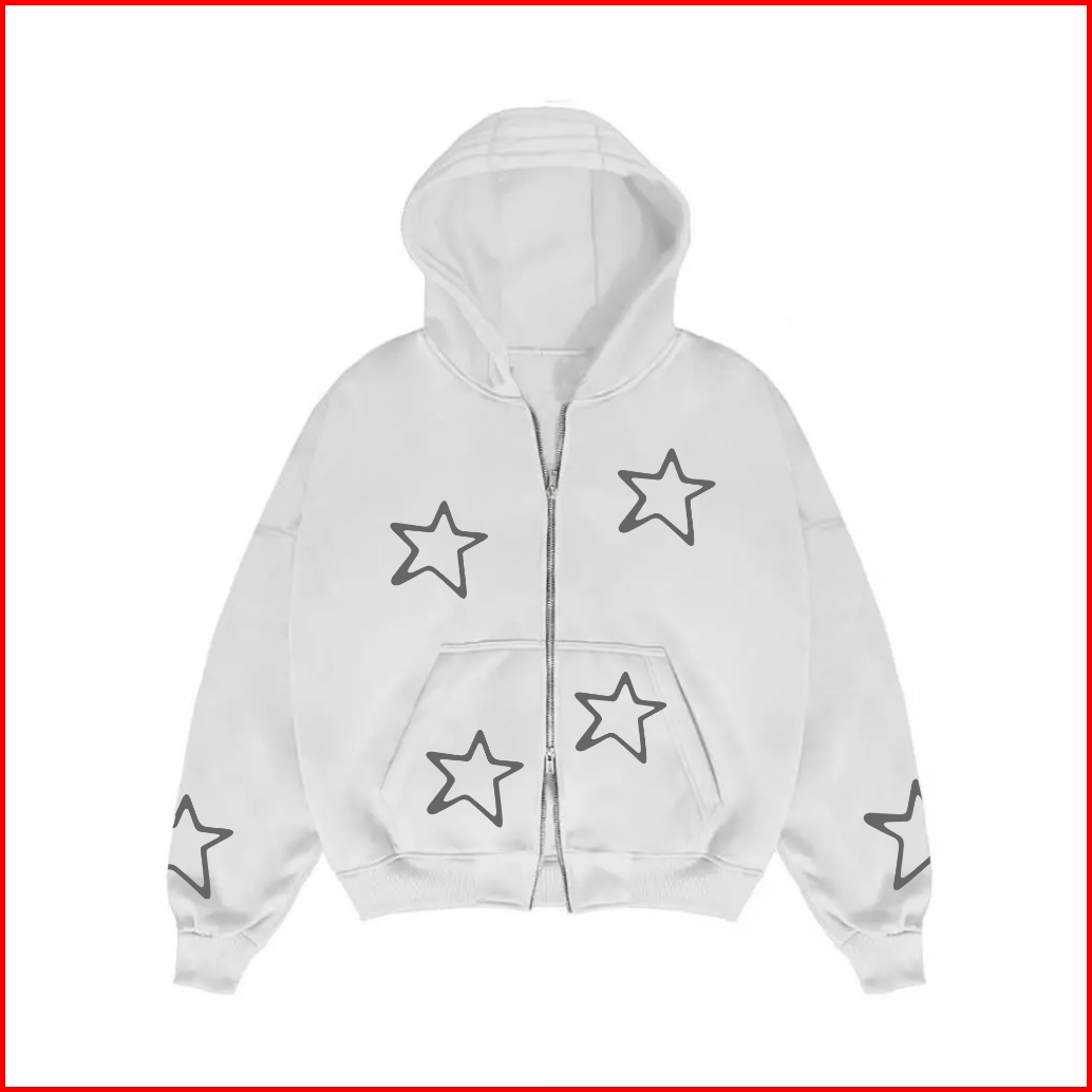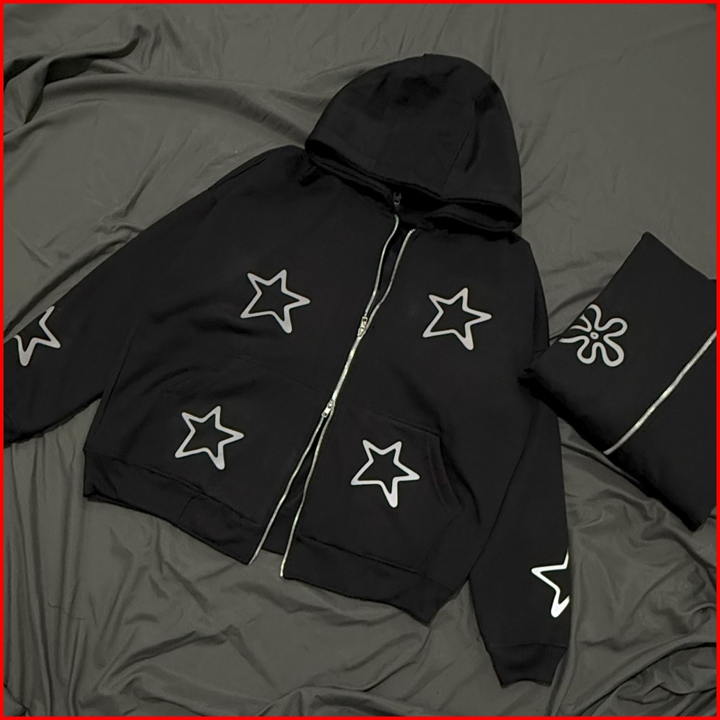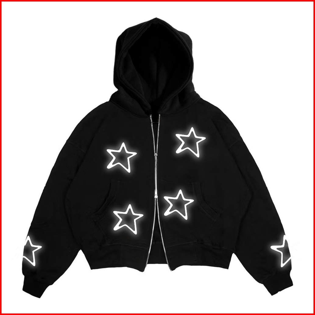 Sprose - Hoodie Boxy Double Zipper Sablon Reflective Menyala Star Fleece Tebal