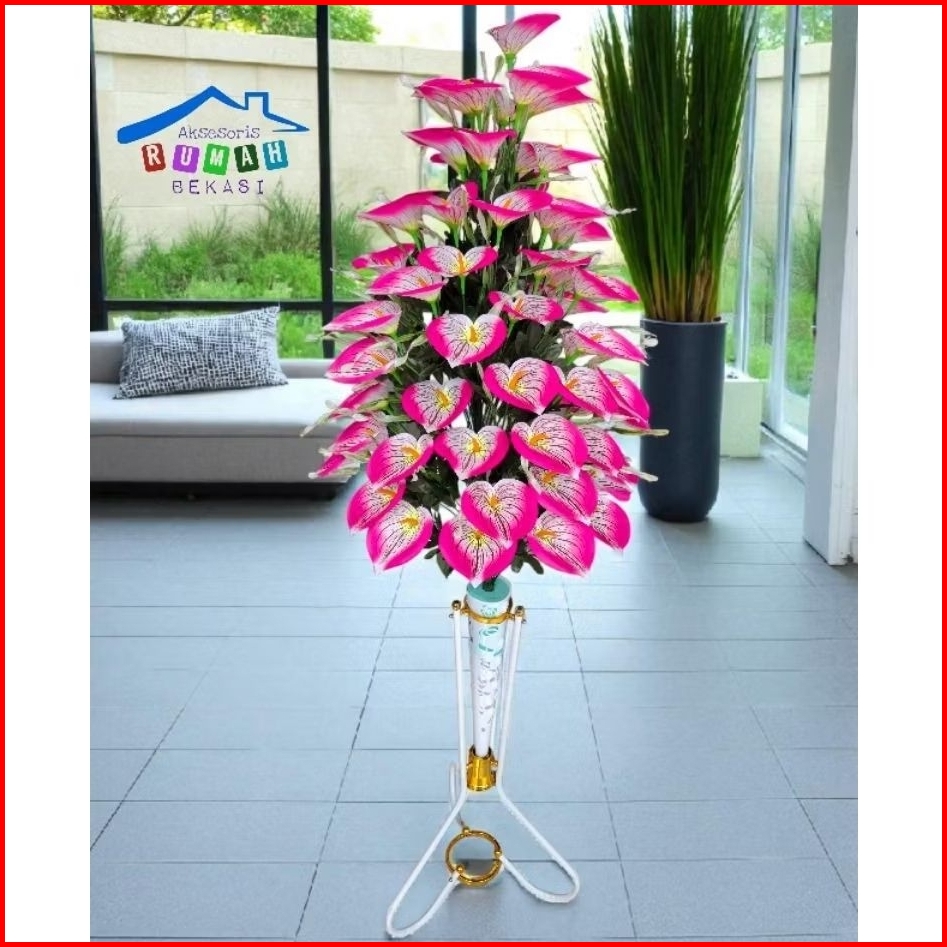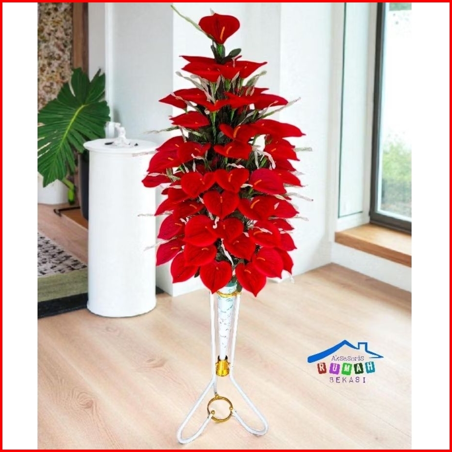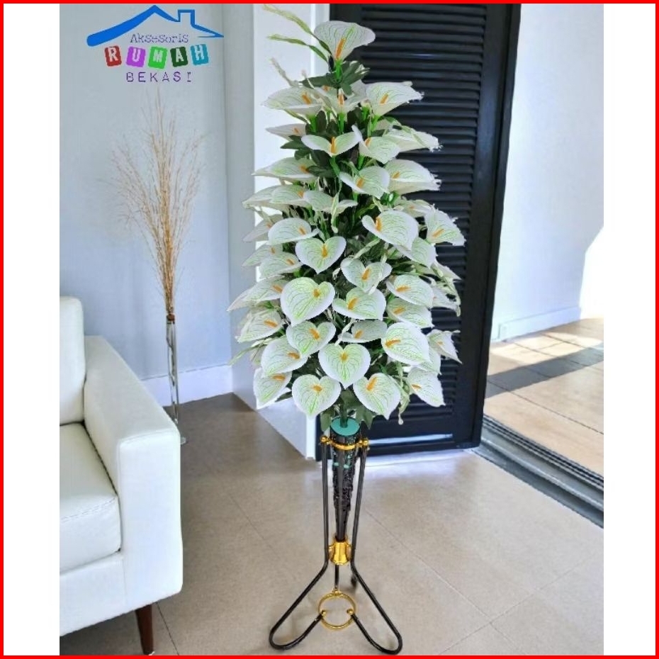 Hiasan Rumah Bunga Anthurium Lily Artificial 60 Kuntum Dengan Pot Standing Besi