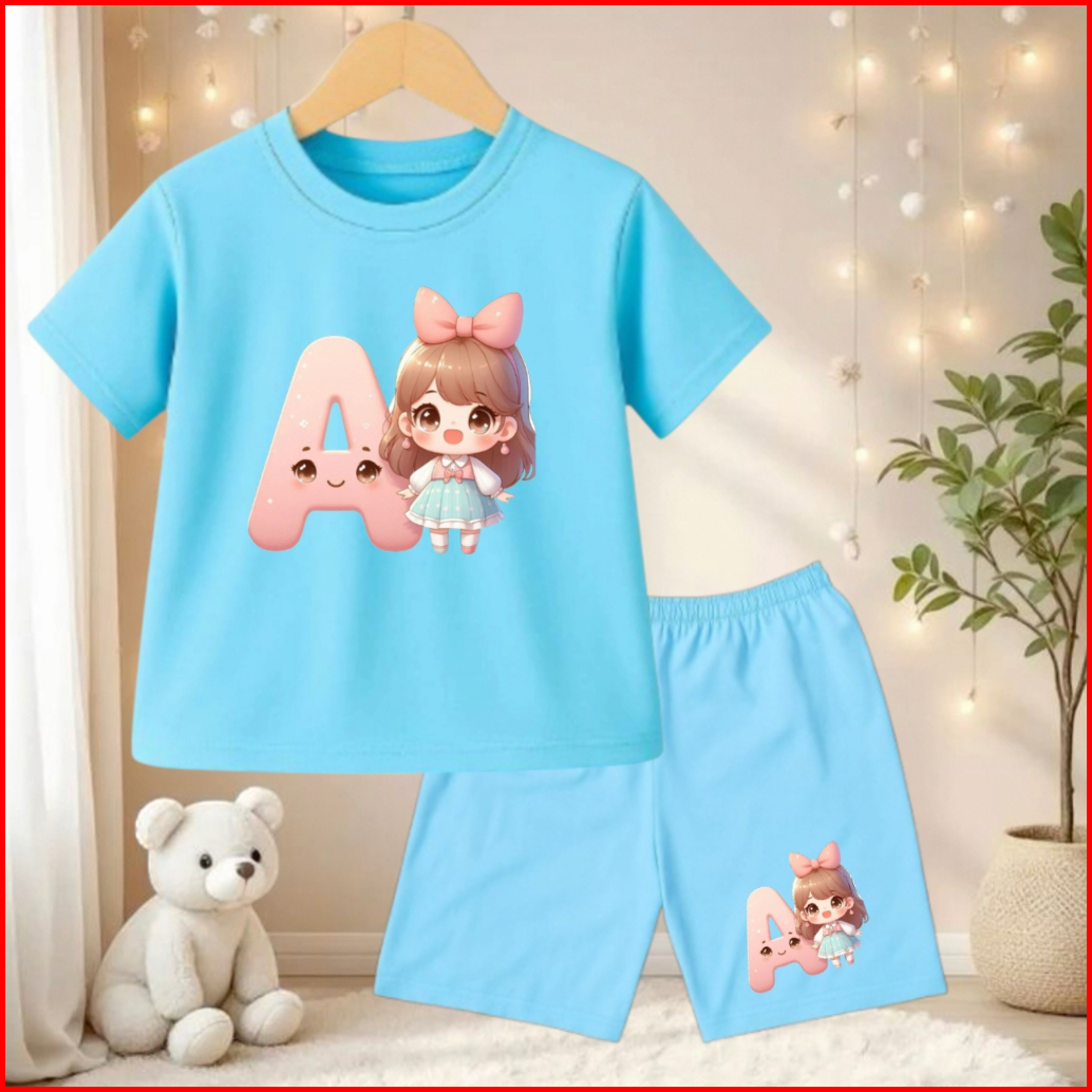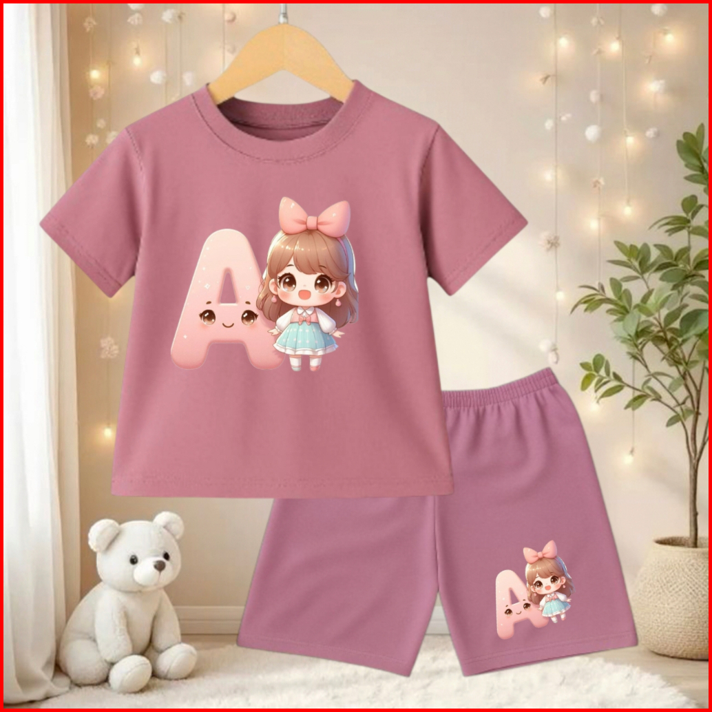 Setelan Anak Cewek Usia 2-12 Tahun Huruf A Kece Kaos Oblong Lengan Pendek Celana Pendek Karet Distro