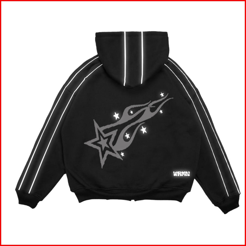 Wrmn Double Zipper Boxy Reflektif Star Fire List Free Gift Hoodie Boxy Sablon Menyala Pria Wanita