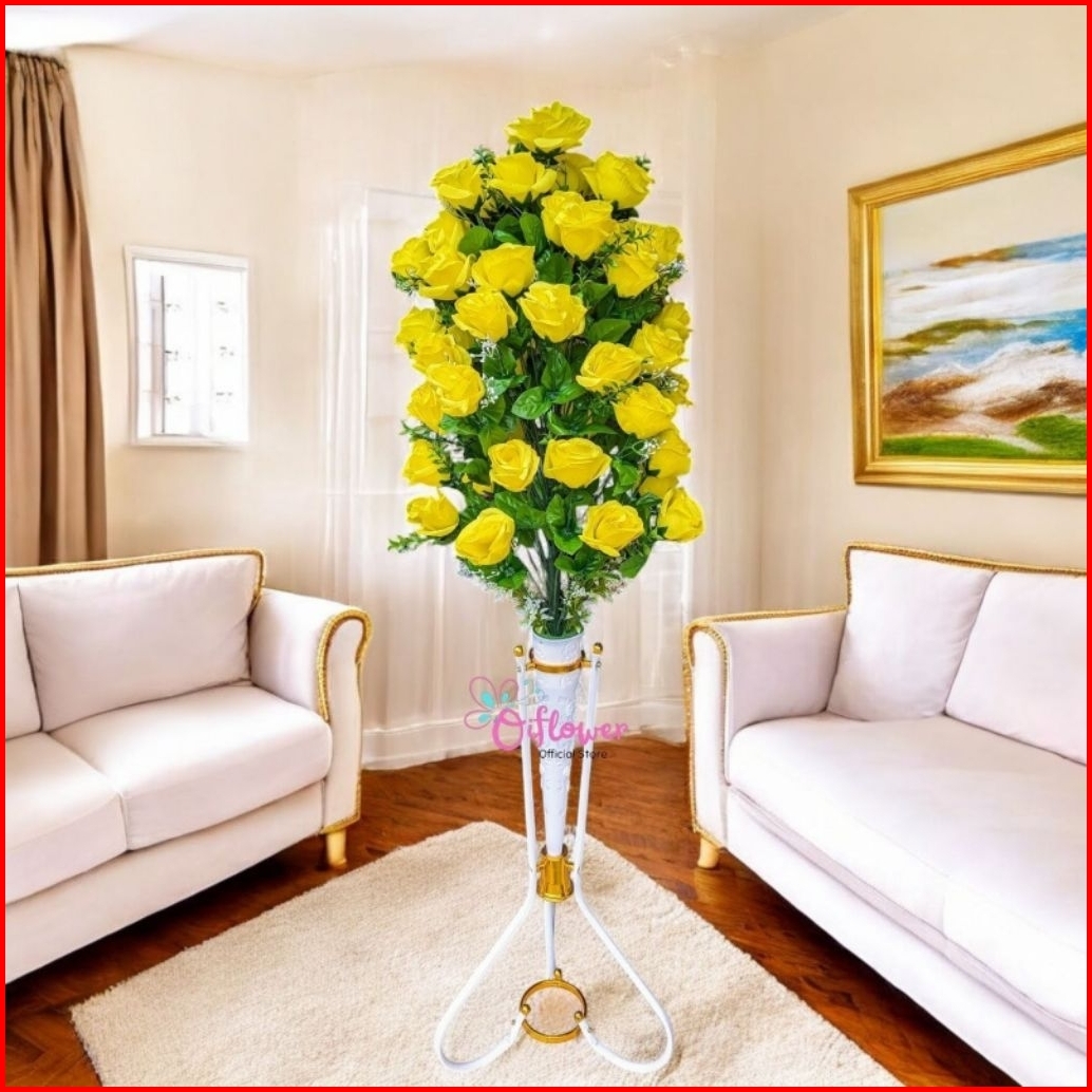 Bunga Hias Mawar Mekar 48.kuntum Satu Set Lengkap Dengan Vas Standing Besi Hiasan Dekorasi Sudut Ruangan