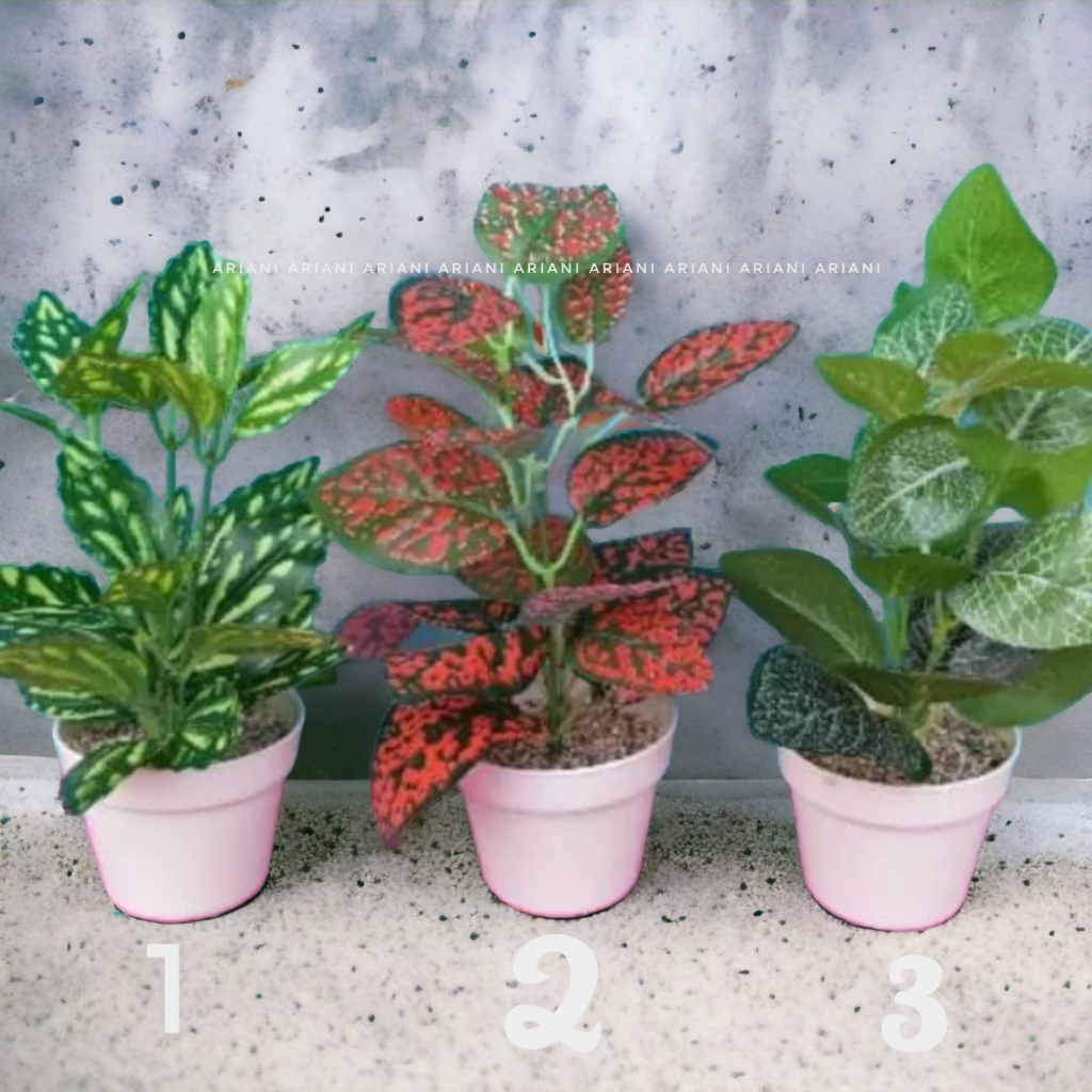 TANAMAN HIAS PLASTIK ARIANI1318 SET BUNGA PLASTIK ANEKA DAUN AGLOMENA DENGAN POT PLASTIK PUTIH DEKORASI RUMAH SHABBY CHI