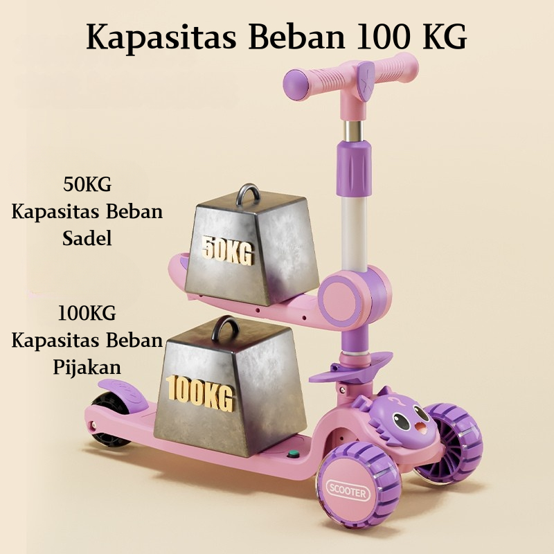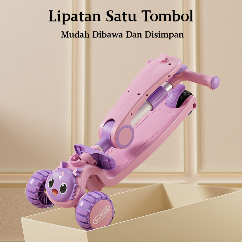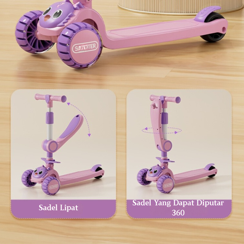 Scooter Anak Perempuan Skuter 2in1 Anak Roda 3 Lipat Aman 2-12 Tahun dengan Lampu Musik