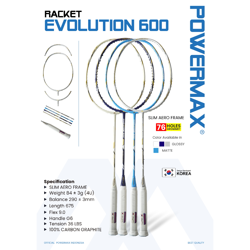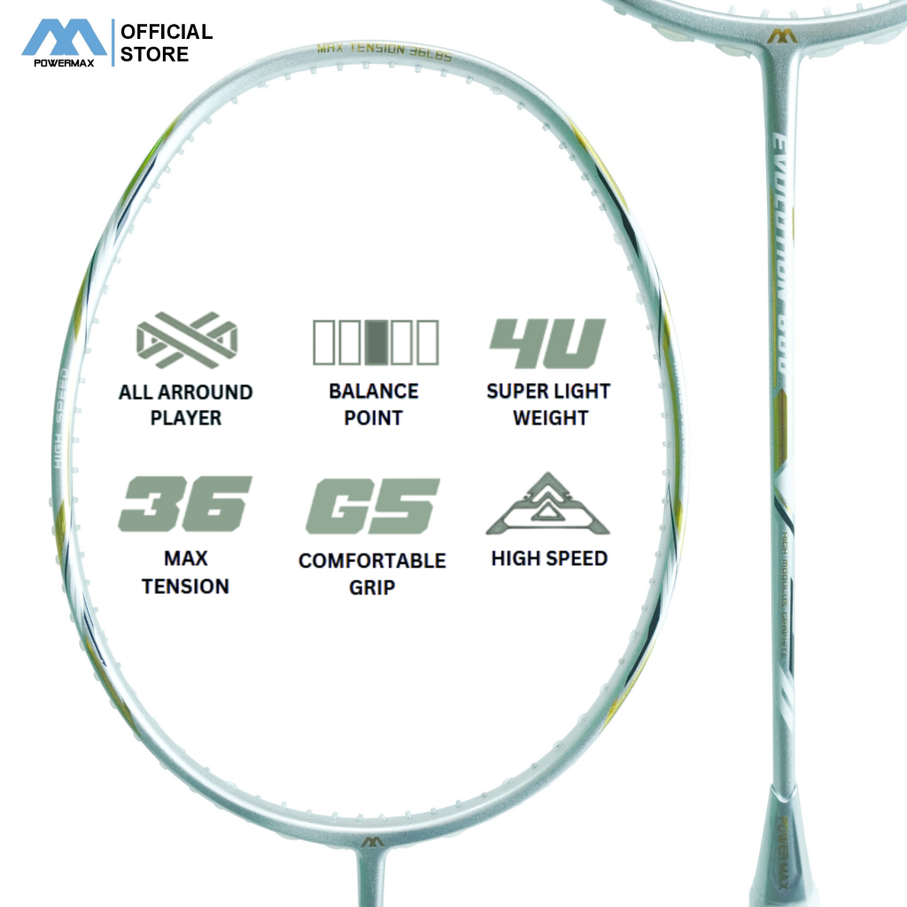 POWERMAX Raket Badminton Evolution 600 Maneuverable Speed Frame High Modulus Graphite 4U Max 36 Lbs