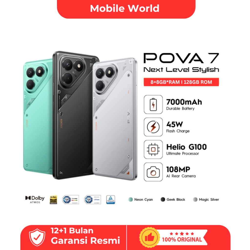 Mobile World TECNO POVA 7 8+8GB/128GB, 7000 mAh, Mediatek Helio G100 Ultimate, 120Hz Vivid Display , 108MP + 2MP Macro Camera