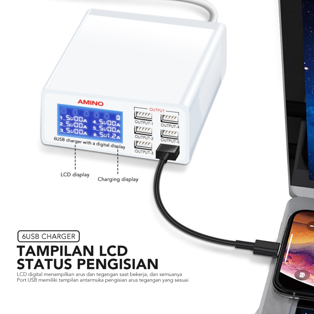 AMINO 6 USB Port Multi Port Charger Fast Charger LED Function 40W 87W PD QC Super Fast Charger TYPE-C Kabel