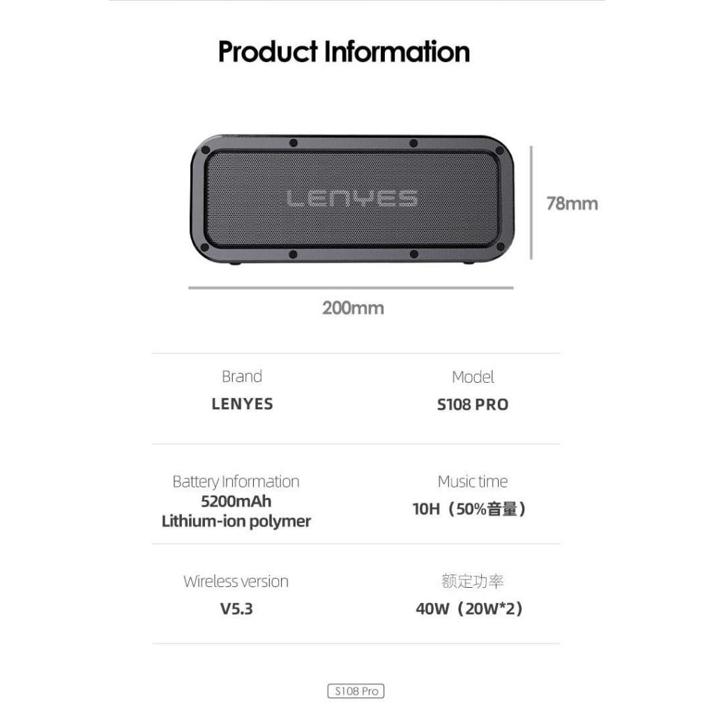 LENYES SPEAKER BLUETOOTH TWS V5.0 SHOCKPROOF AND WATERPROOF IPX7 40WATT HIFI STEREO S108