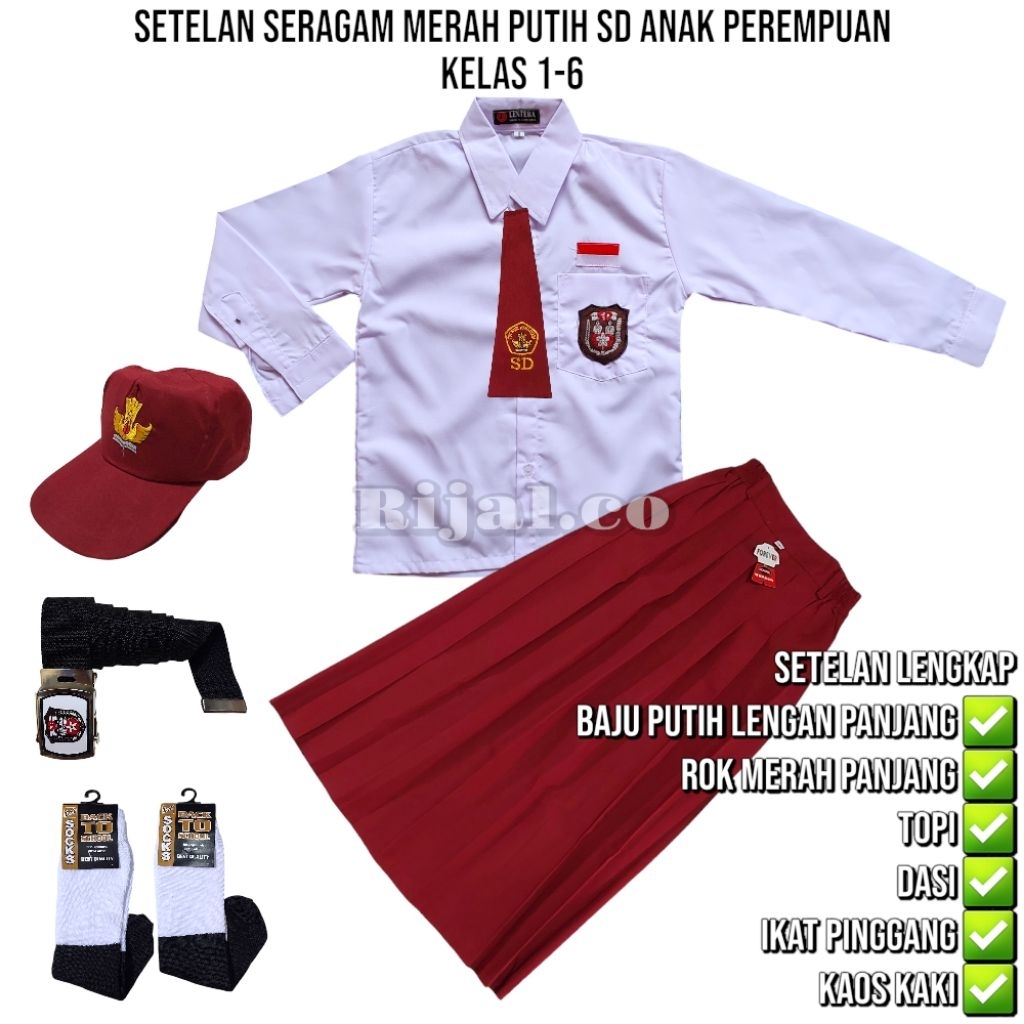 setelan seragam merah putih sekolah SD anak perempuan baju lengan panjang rok merah panjang