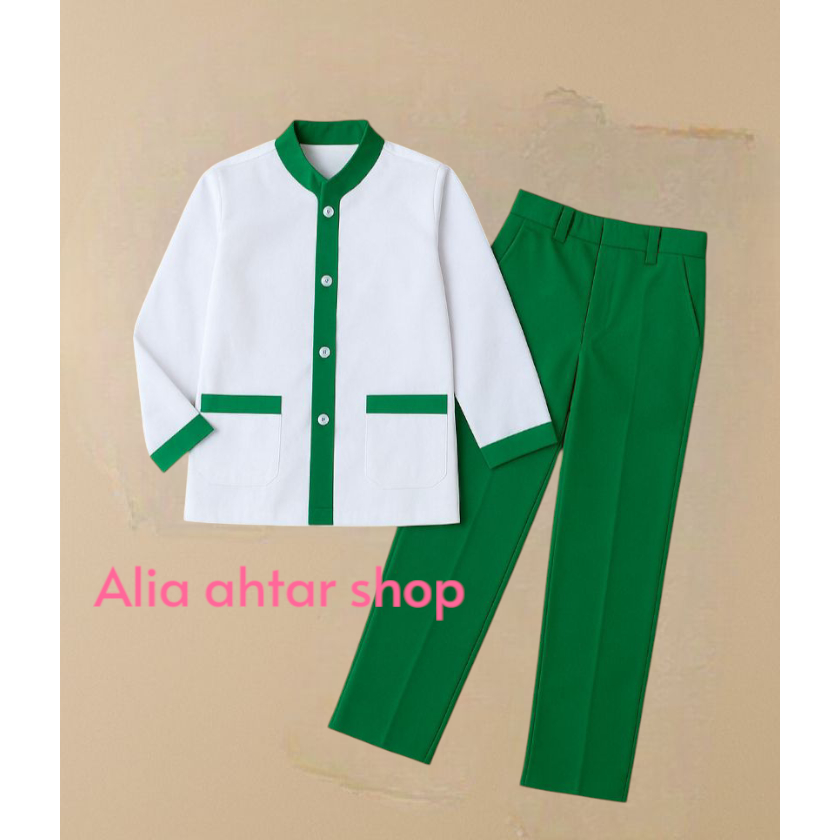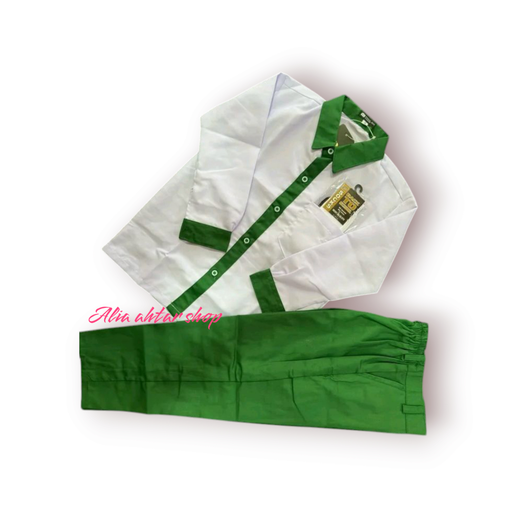 Setelan Seragam Sekolah Madrasah Ibtidaiyah (MI) Untuk Anak Laki-Laki Baju Putih Plat Hijau Panjang dan Celana Hijau Pan