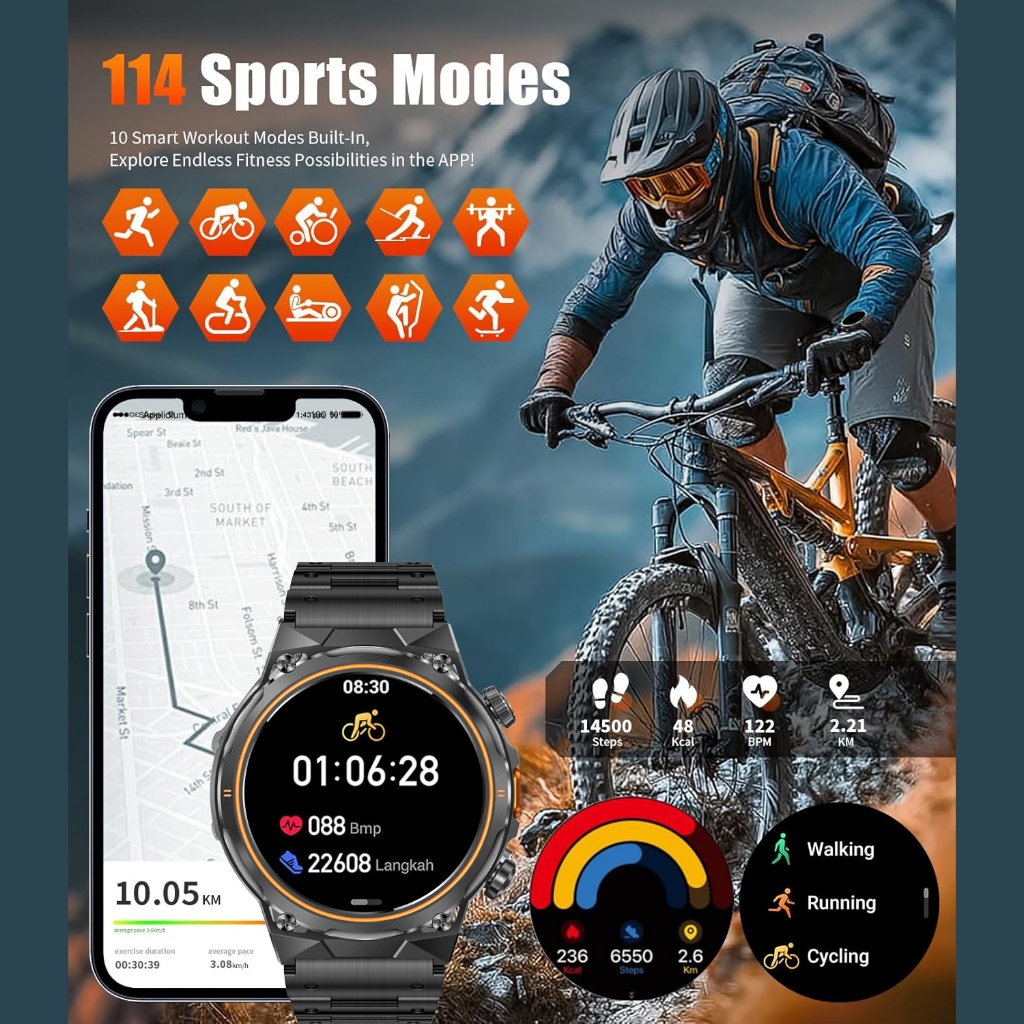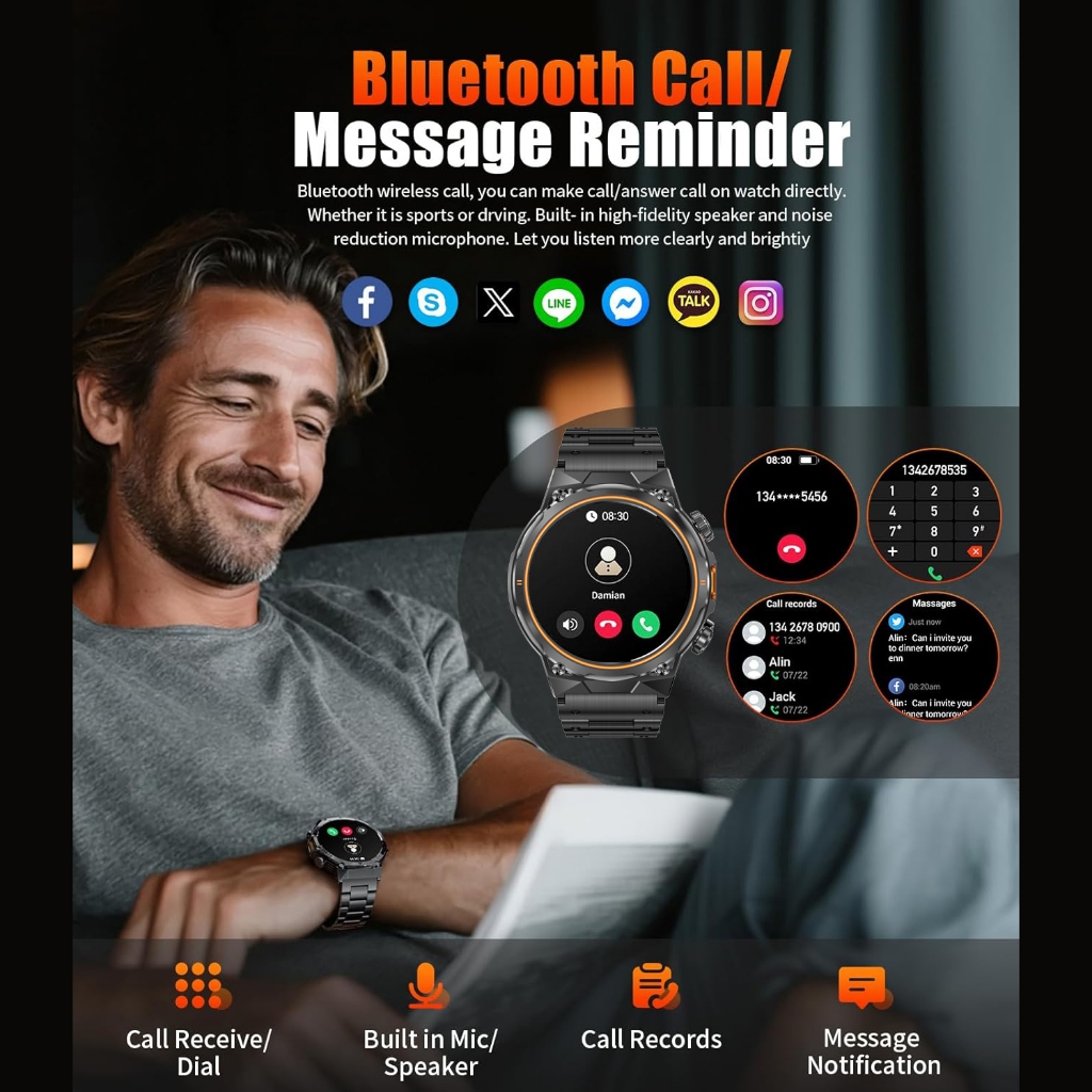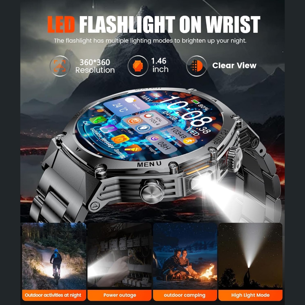 Smartwatch ENC Military for Men,400mAh Large Battery/1.46" HD Smartwatch Pria with LED Flashlight for Android iOS (Bluet