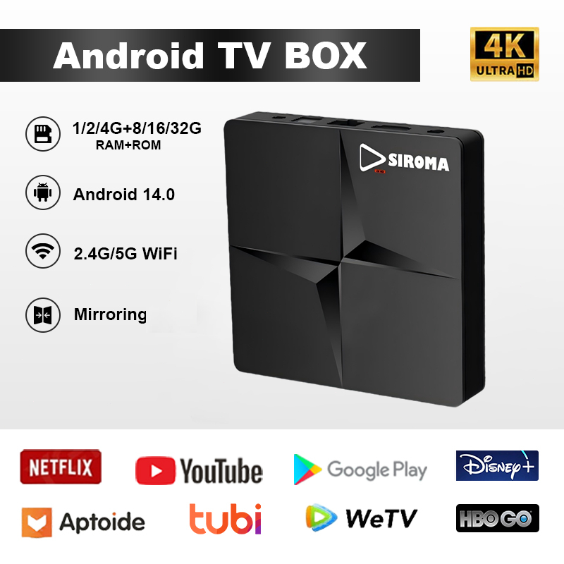 Siroma Android Tv Box Mini 4K-HD Ultra Android 13 Ram 1/2/4GB Rom 8/16/32GB WIFI 2.4G/5G Bluetooth Smart Tv Box Unlock FULL CHANNEL TV & Film & APP (Netflix / Disney / SKY TV)