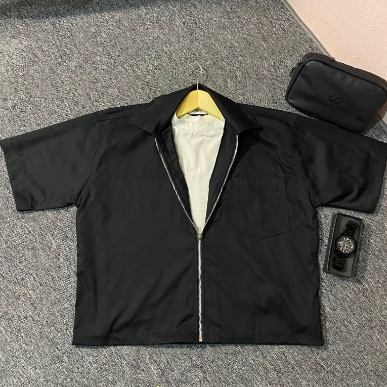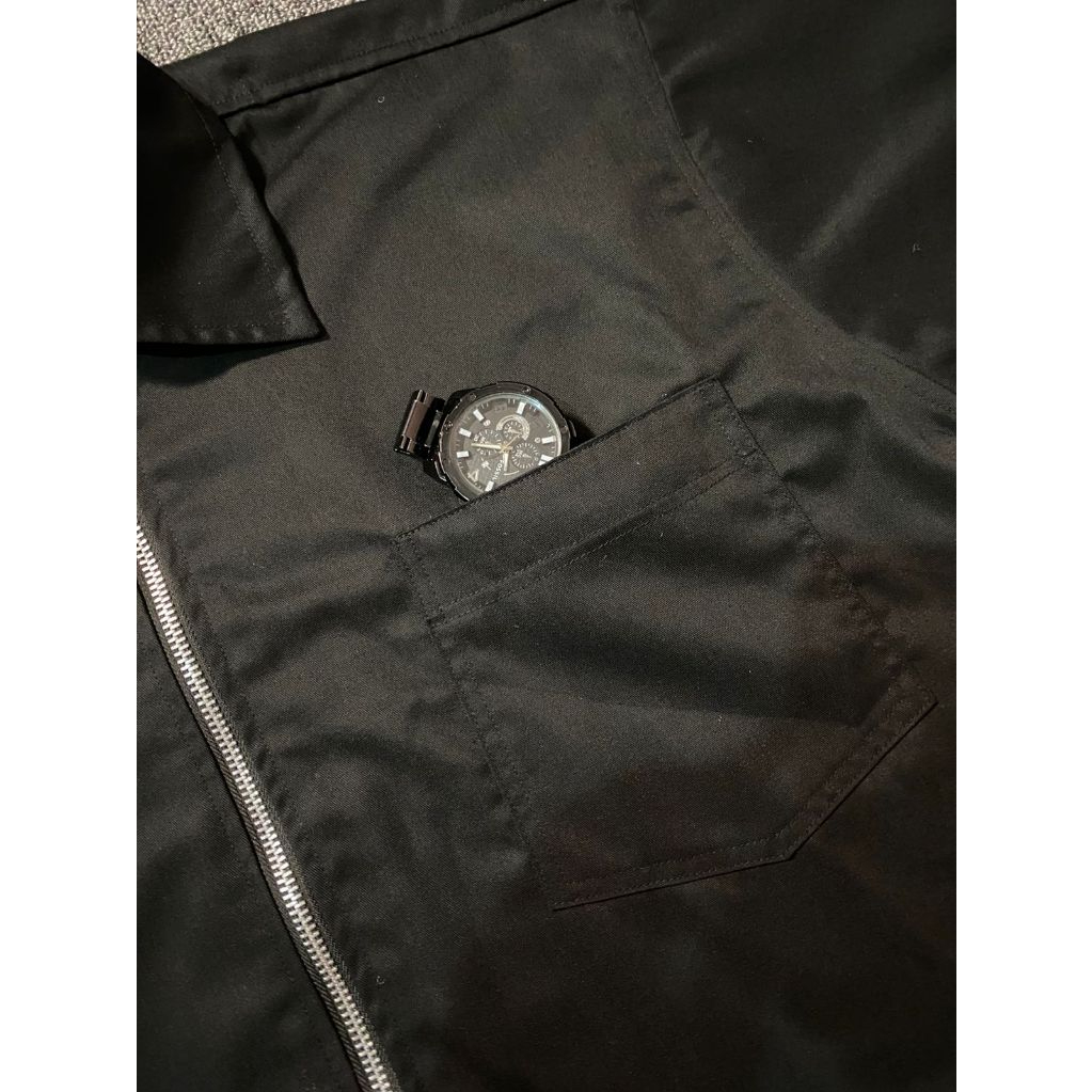 Confucius - Kemeja Workshirt Boxy Fit Zipper Black Shirt Unisex Black Kemeja Hitam - By. Confucius