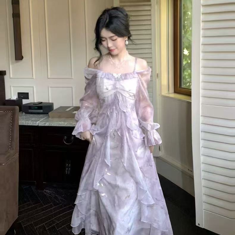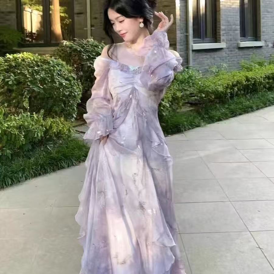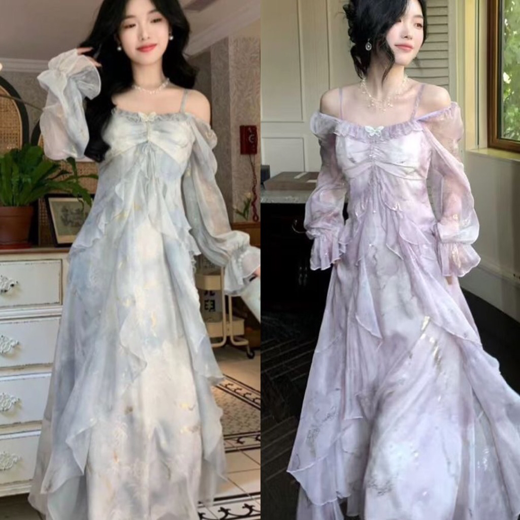 Gaun Panjang Peri Berenda Motif Kupu-Kupu French Style | Dress Wanita Pinggang Ramping Lengan Panjang