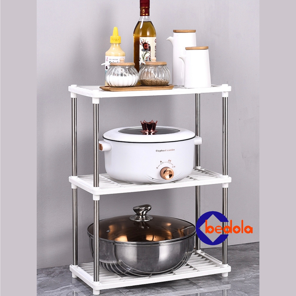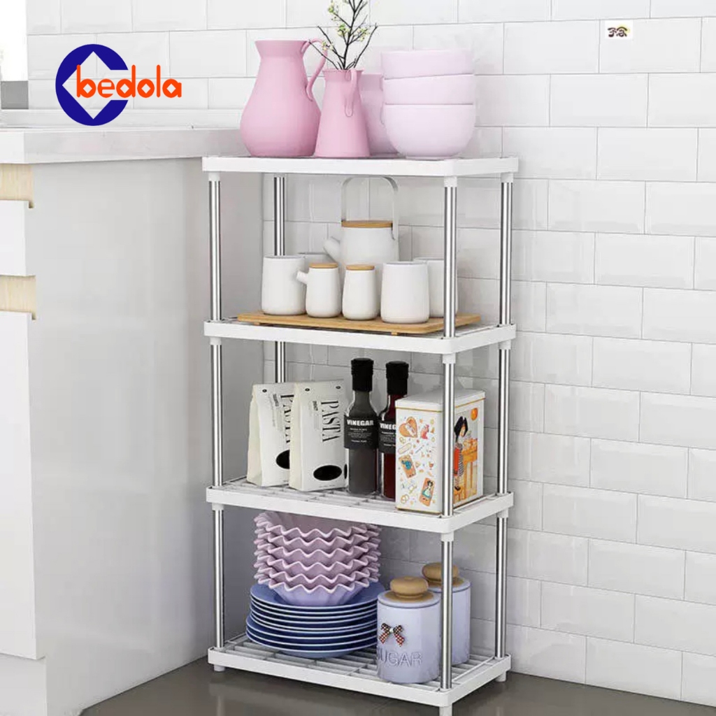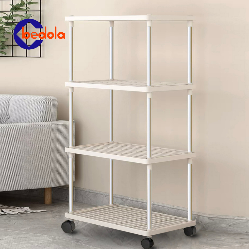 Rak dapur plastik acsthetic rak susun rak serbaguna rak panci putih 4 layer dengan roda free 3 kait