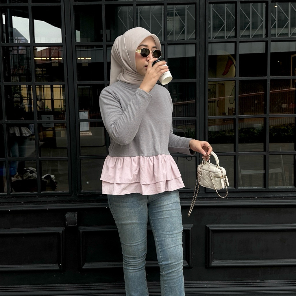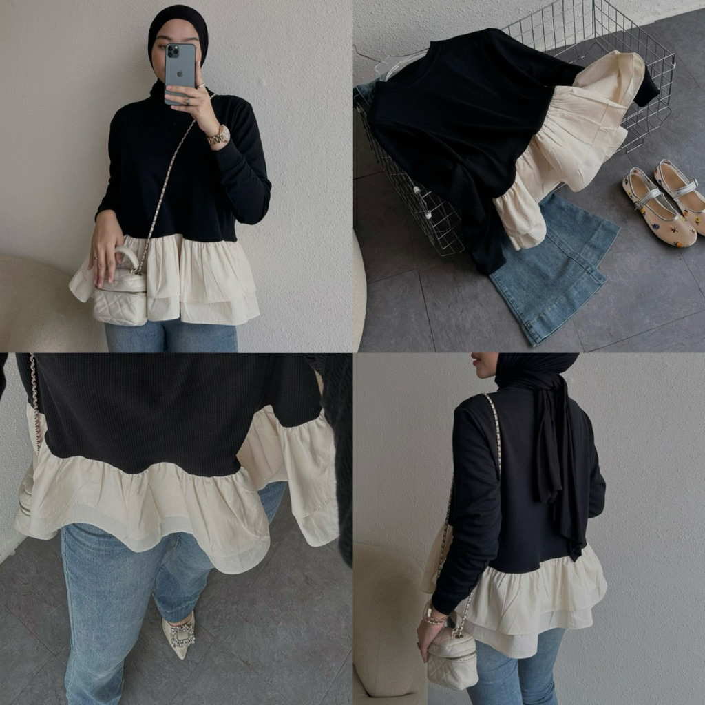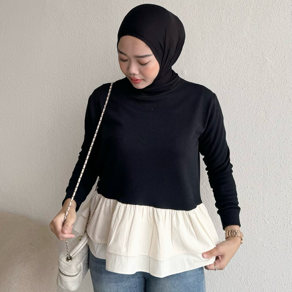 Floral Id - Blouse Peplum Knit Mix Poplin Nerina Blouse Rample Wanita Lengan Panjang