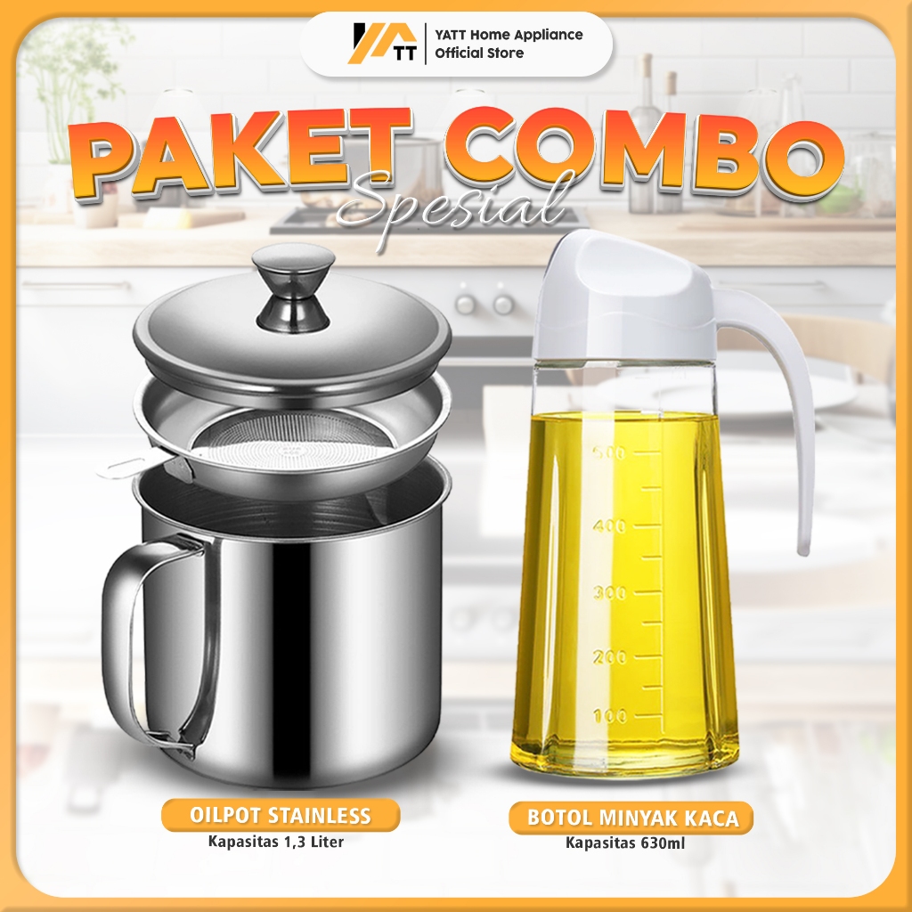 YATT Paket Combo Spesial Botol Minyak Kaca 630ML + Oil Pot Wadah Minyak Stainless Steel 1,3L