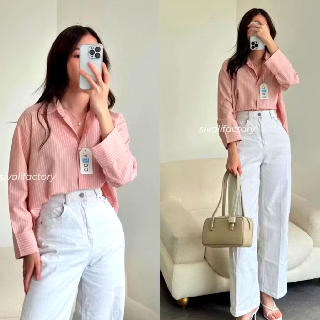 Ziggy Top Stripe Luna Kemeja Salur Garis Oversized Crop Atasan Wanita Lengan Panjang Cewek Kekinian