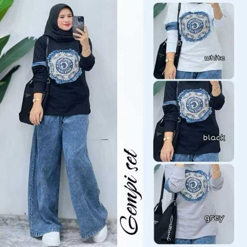 BAJU SETELAN CELANA XL,XXL WANITA MOTIF KUPU KUPU, BAHAN COMBED KOMBINASI JEANS WASH, SETELAN TERLARIS DAN POPULER