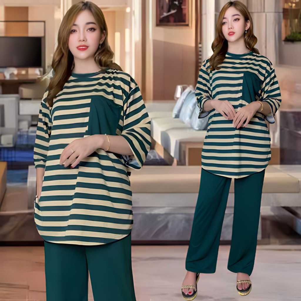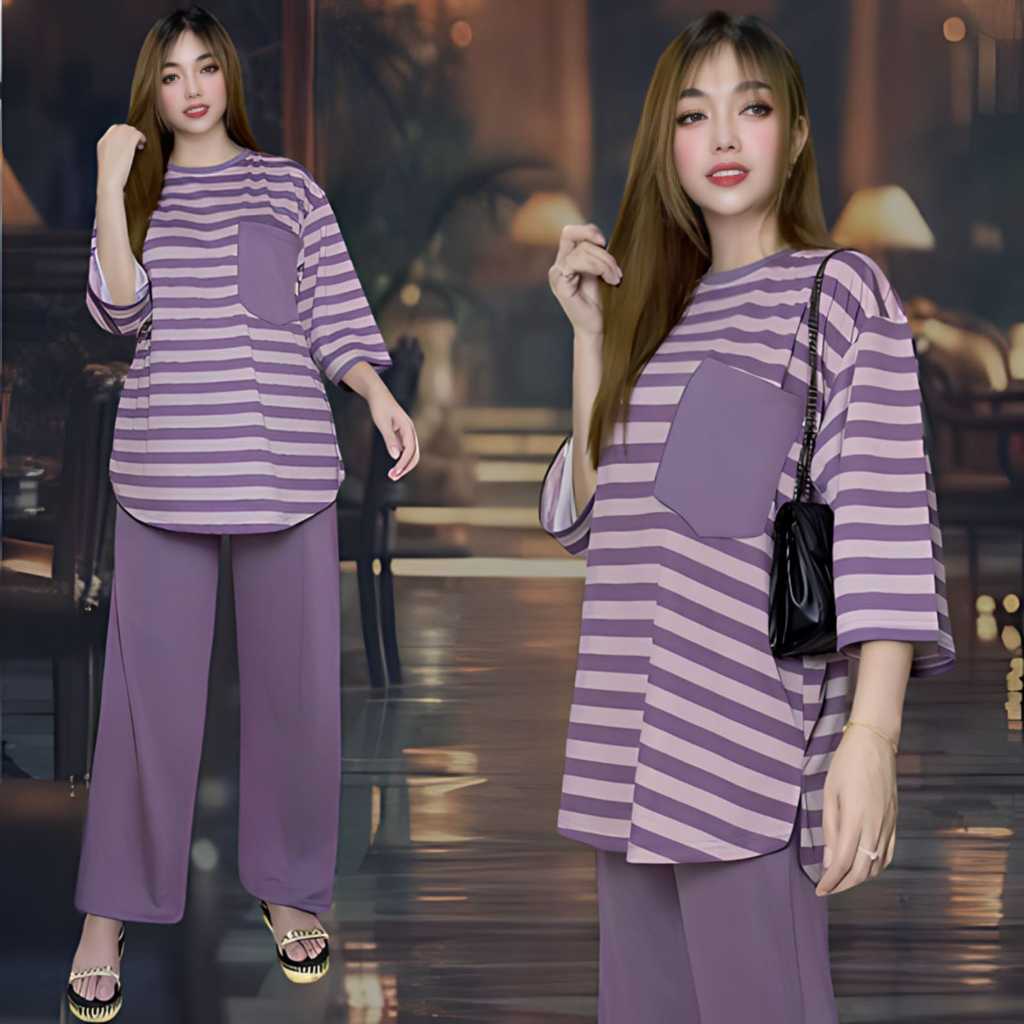 AUFAA ONESET ATASAN OVAL KANTONG DADA LD 120 VISTATERRY MOTIF SALUR celana karet wanita setelan baju basic Panjang Oversize