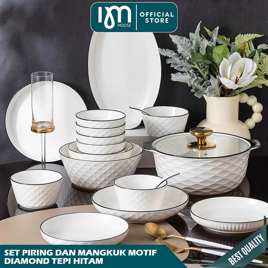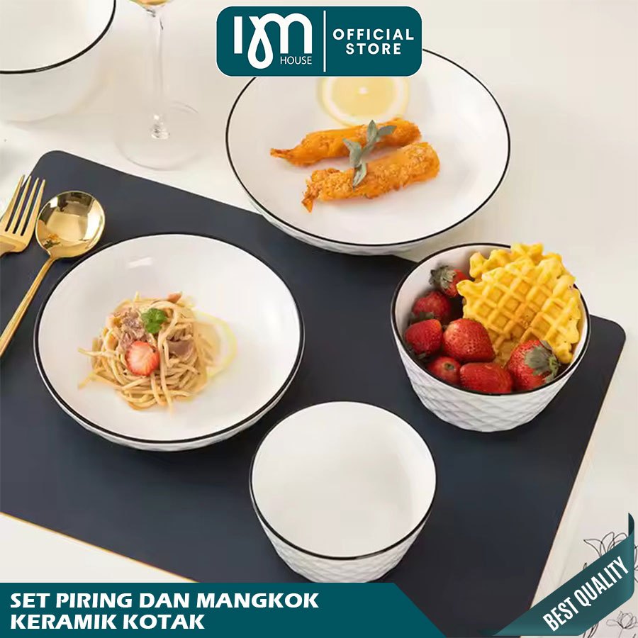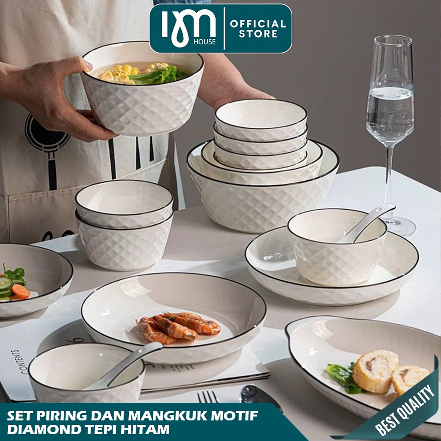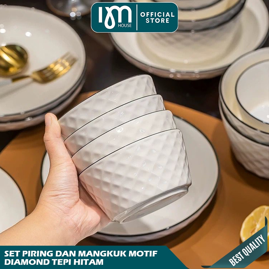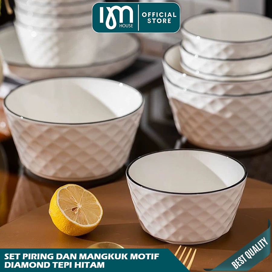 INMINDHOUS-6 PCS Piring dan Mangkuk Makan Keramik Putih List Hitam Elegant / Diamond Pattern Elegan Murah Gratis Ongkir