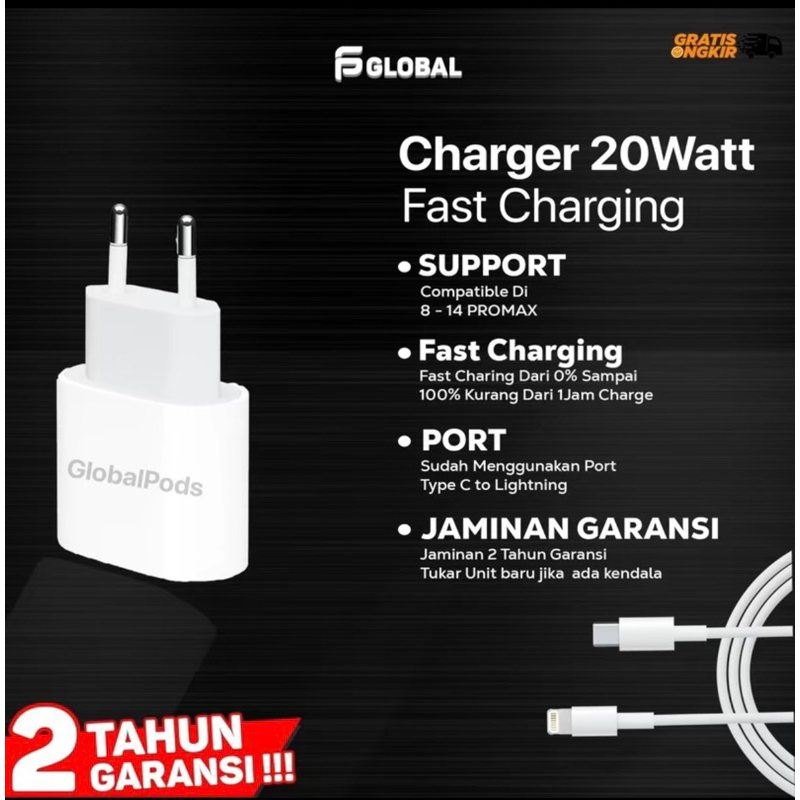 [Garansi 2 Tahun] GlobalPods Charger iP 20w Fast Charging 1 Set Adaptor + Kabel