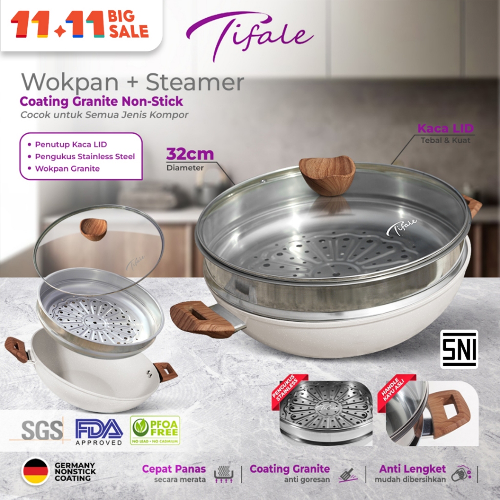 TERLARIS Tifale [2IN1] Wokpan + Glass Lid Panci Kukus 32CM White Anti Lengket Dandang Steamer Non Stick Panci Mpasi