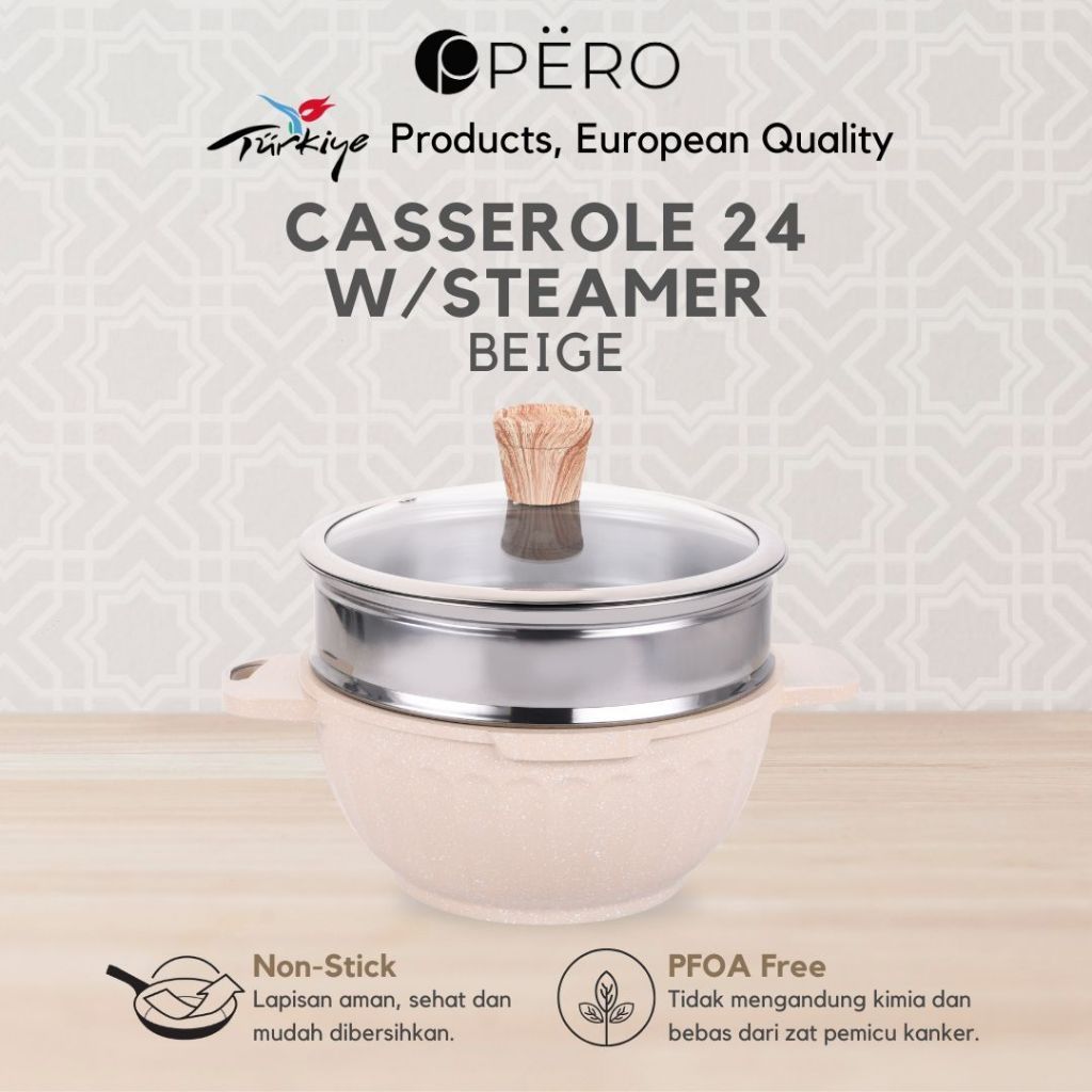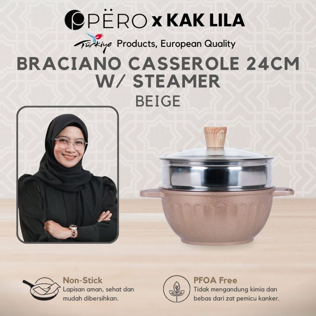 TERLARIS [Kak Lila] Pero Braciano Casserole 24cm with Steamer / Glass Lid Wooden Knop / Panci Anti Lengket / Set Cookwar