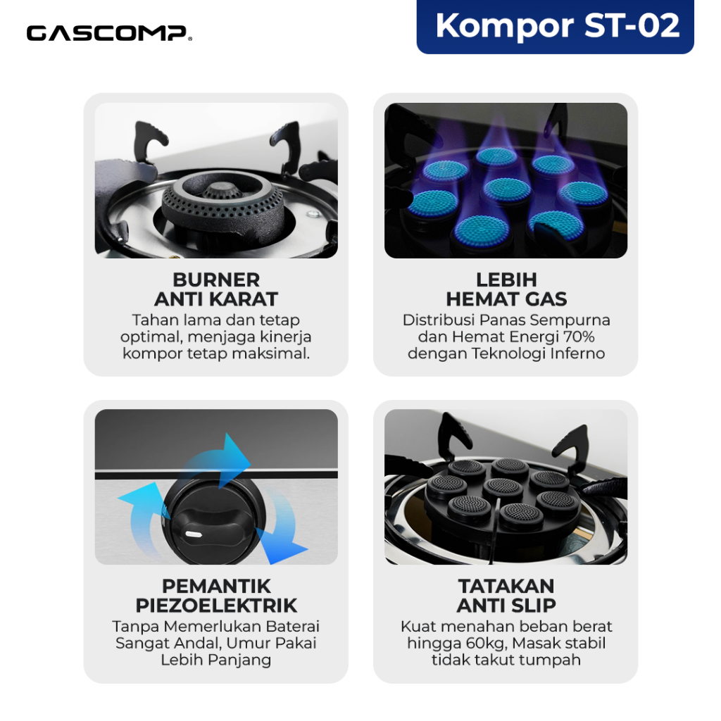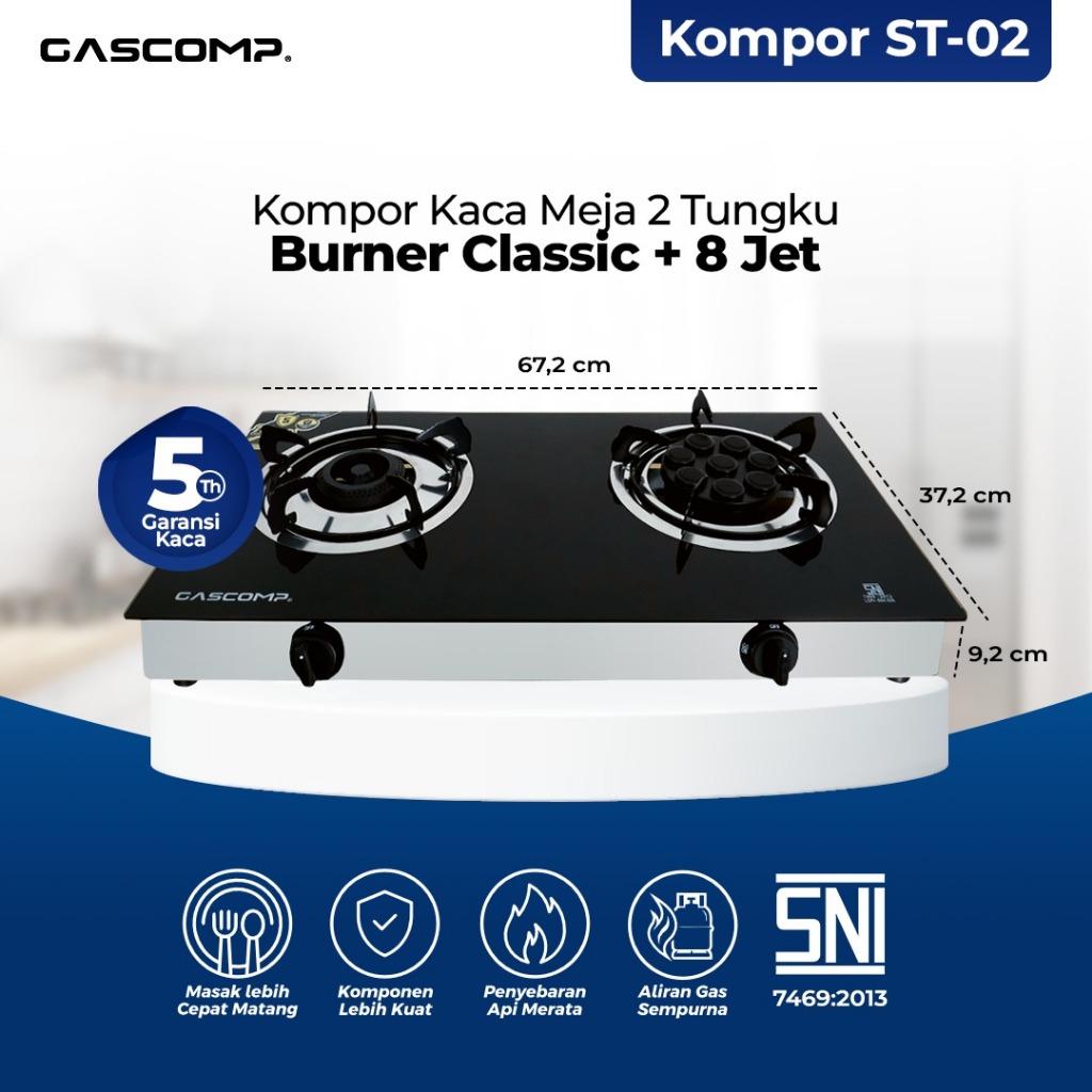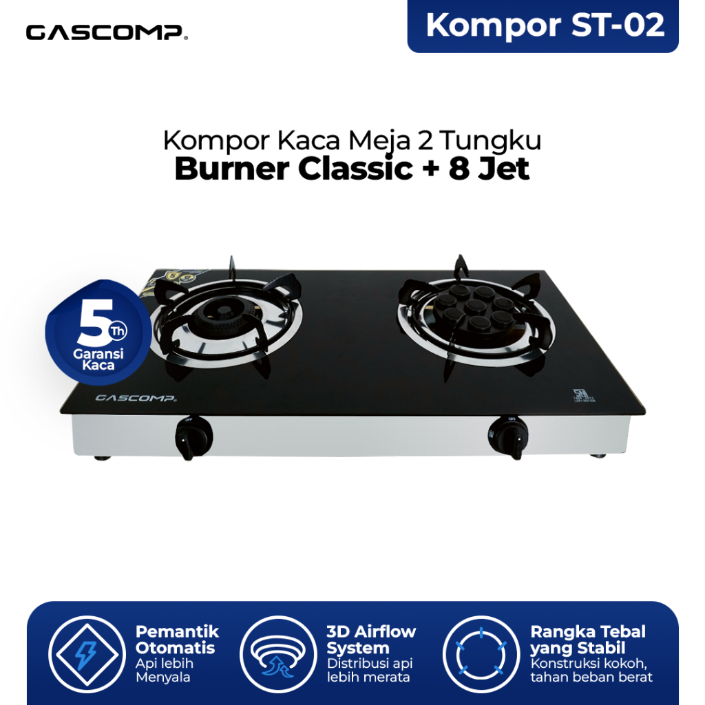 TERLARIS GASCOMP Kompor Gas Meja Kaca Classic + 8 Jet | Kompor Gas 2 Tungku Elegan | Api Besar Hemat Gas | Kompor Dapur