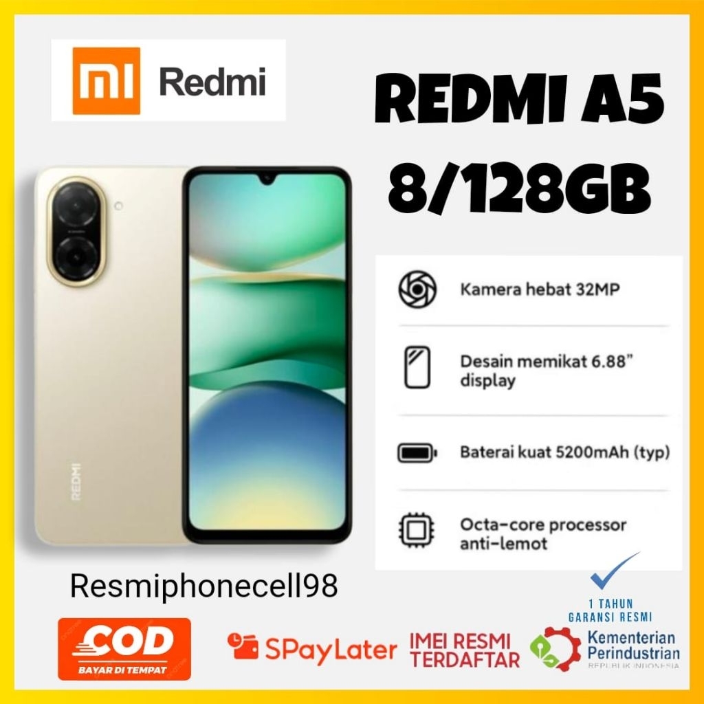 Redmi A5 Ram 8+128 GB kamera 32mp baterai 5200 mah garansi resmi 1 tahun (imei terdaftar)