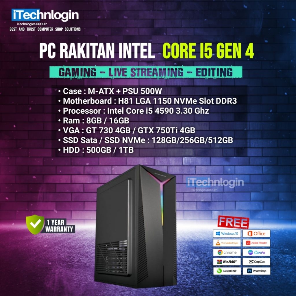 PAKET CPU / PC RAKITAN INTEL Core i5 4590 RAM 16GB / VGA GTX 750Ti 4GB / SSD NVMe 512GB / HD 500GB PC Office / Live Streaming / Editing / Gaming DLL