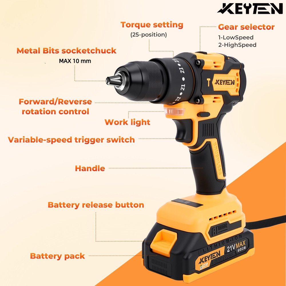 KEYTEN Bor Dampak Nirkabel Set Brushless Cordless Impact Drill Bor Baterai Alat Listrik Sekrup Nirkabel