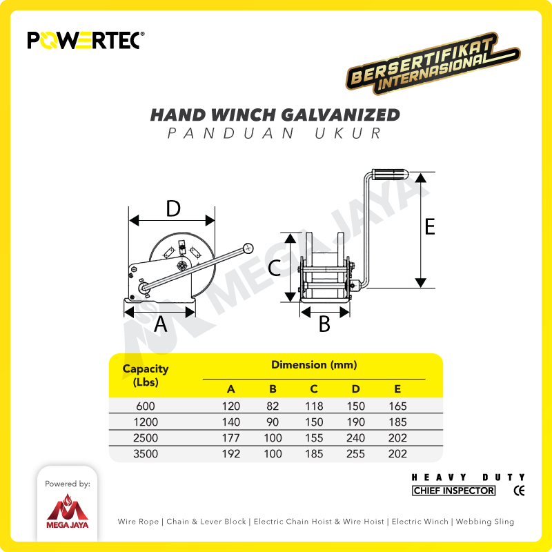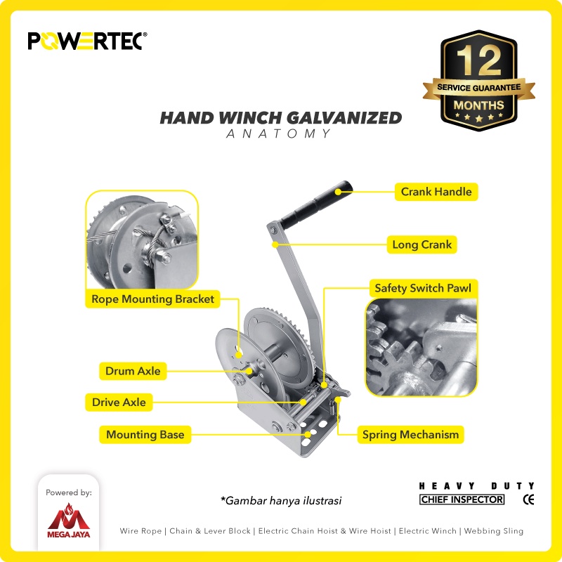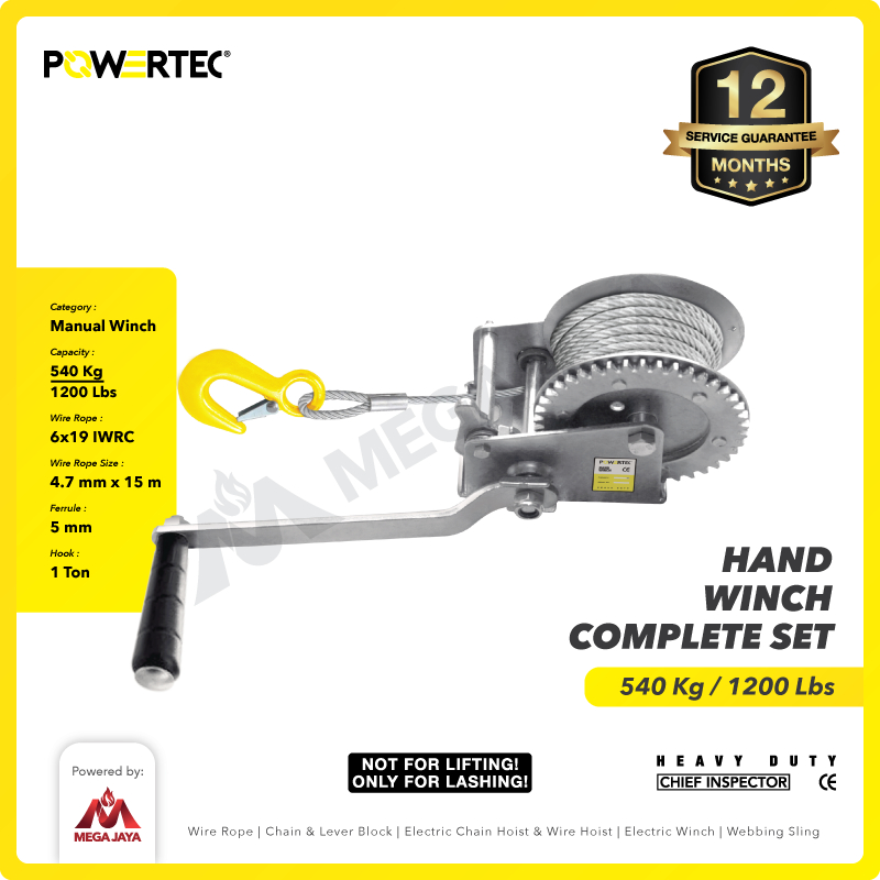 POWERTEC Hand Winch / Katrol Manual 1200lbs / 540Kg x 15 M Galv