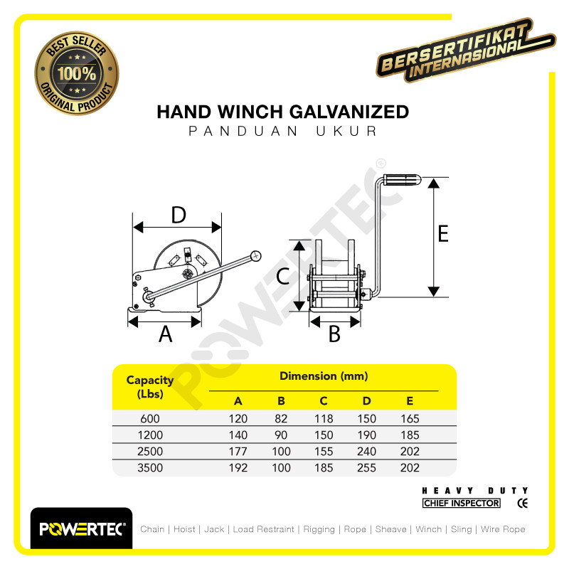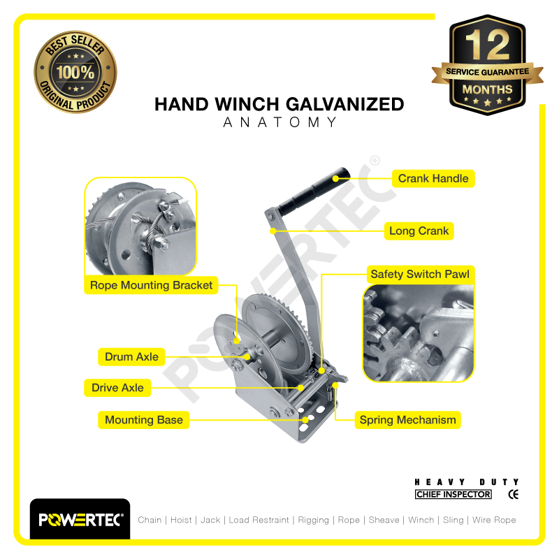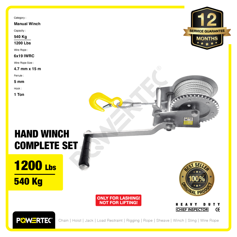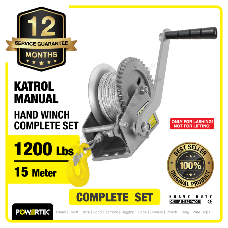 POWERTEC Hand Winch / Katrol Manual 1200lbs / 540Kg x 15 M Galv