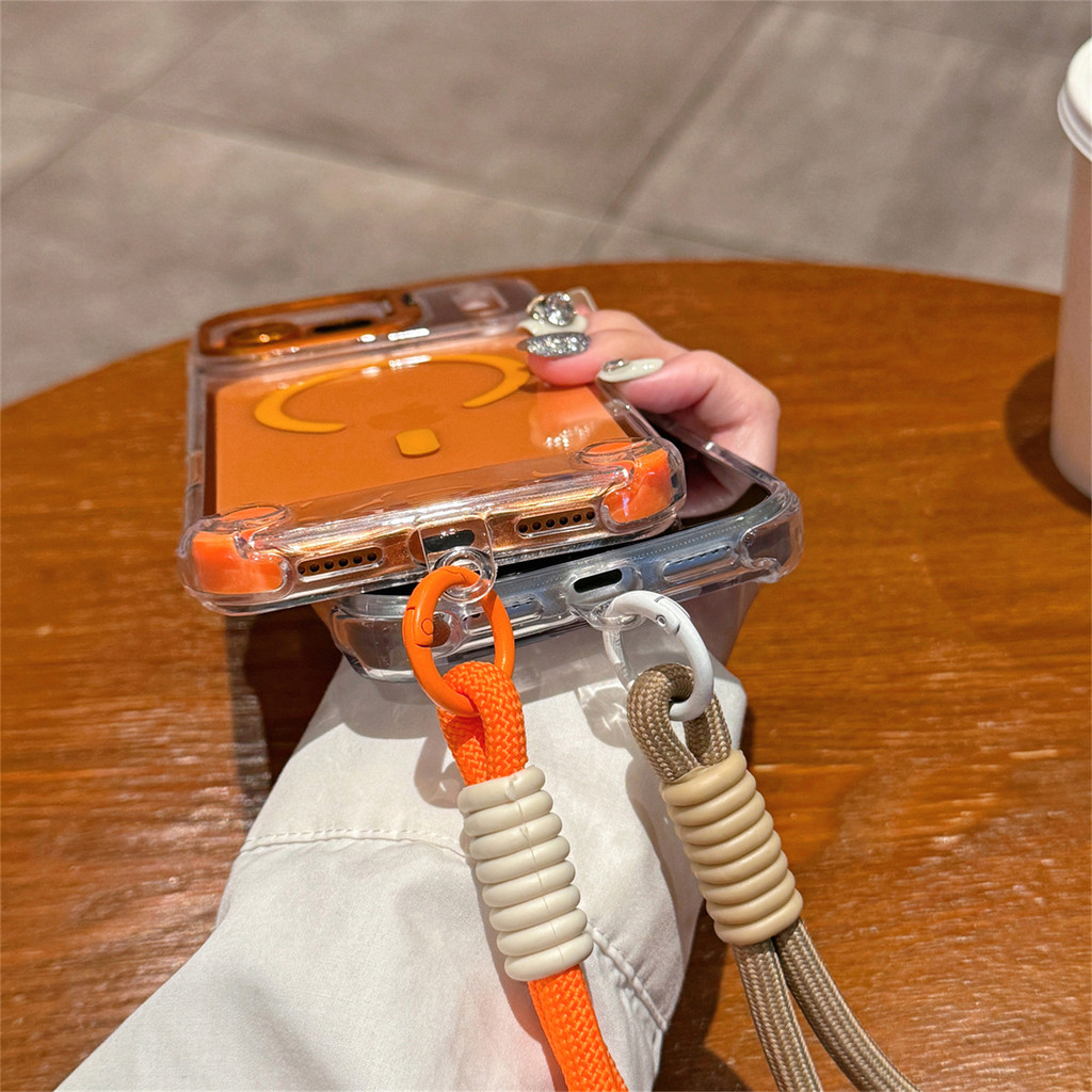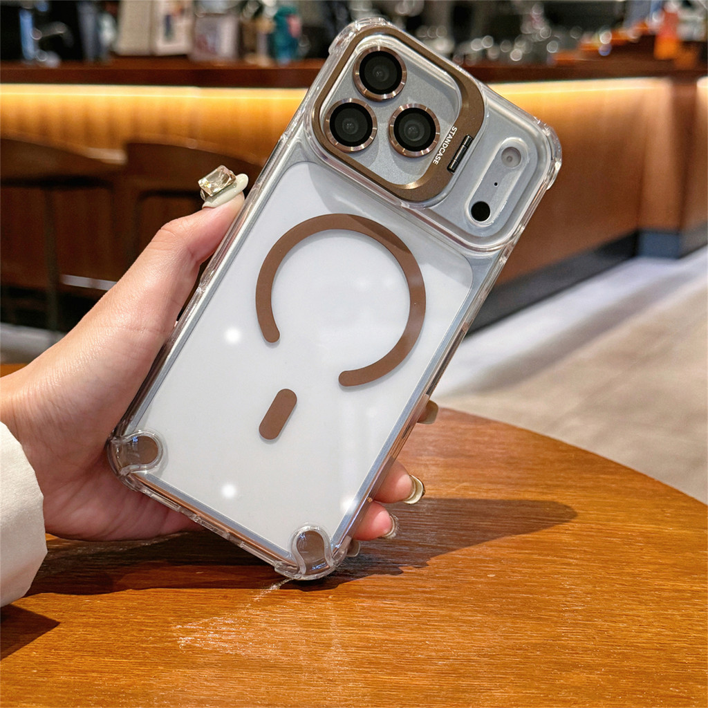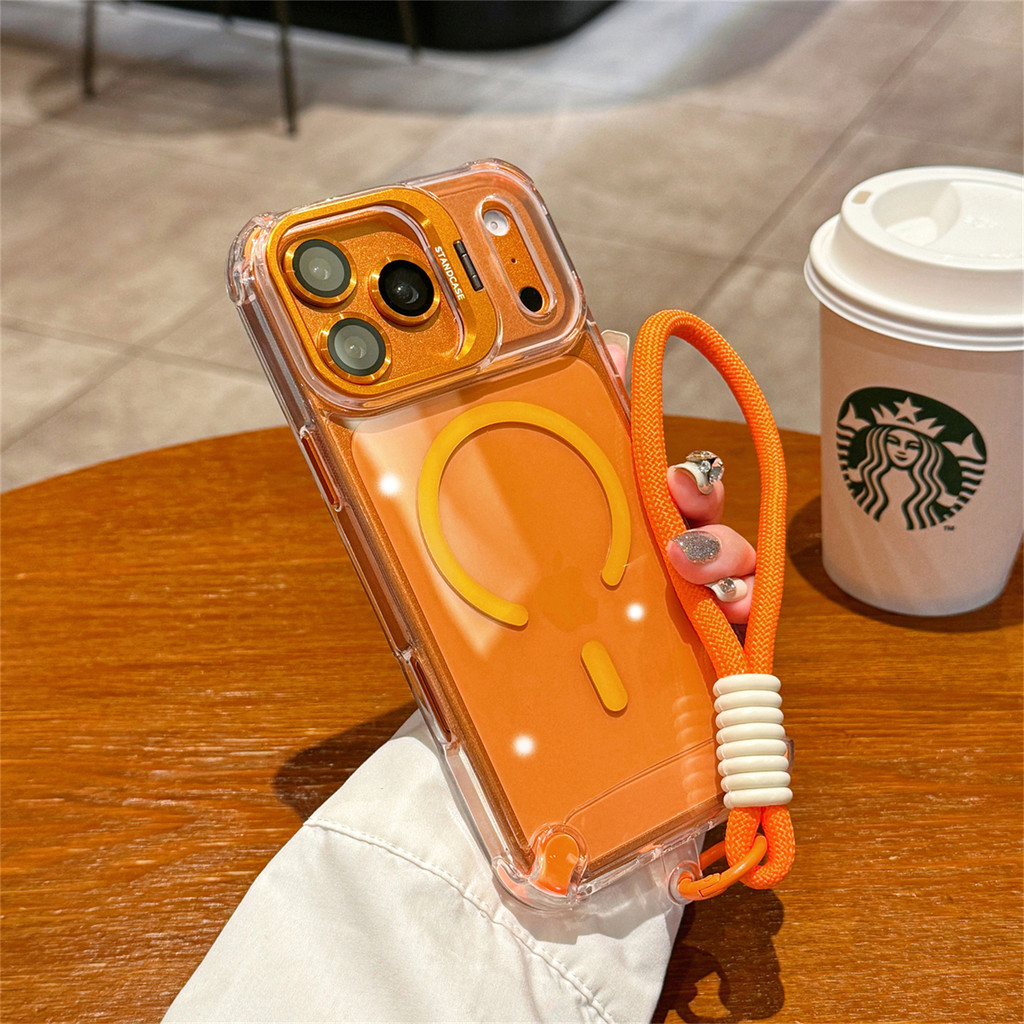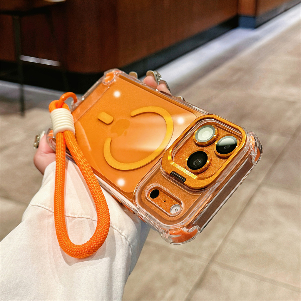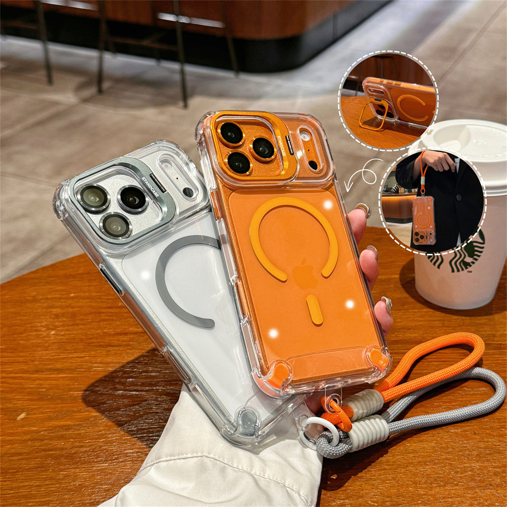 New Luxury Magnetic Transparent Lanyard Shockproof Case for iPhone 17 16 15 Pro Max with Metal Stand Glass Lens Protecto