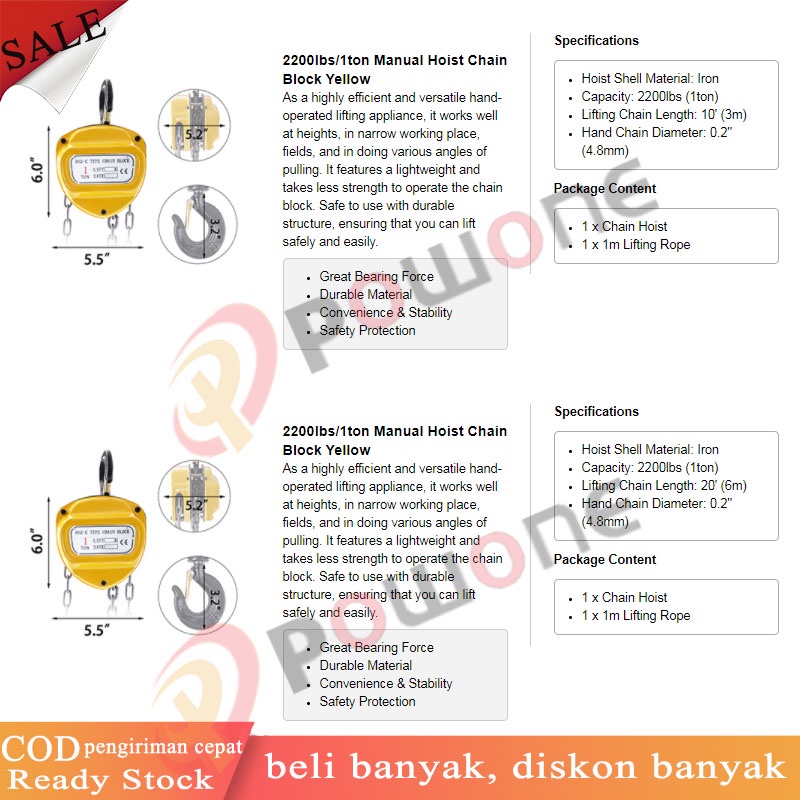1Ton/2000Lbs 2Ton/4000LBS 3m 6m Manual Hand Lift Steel Chain Block Hoist