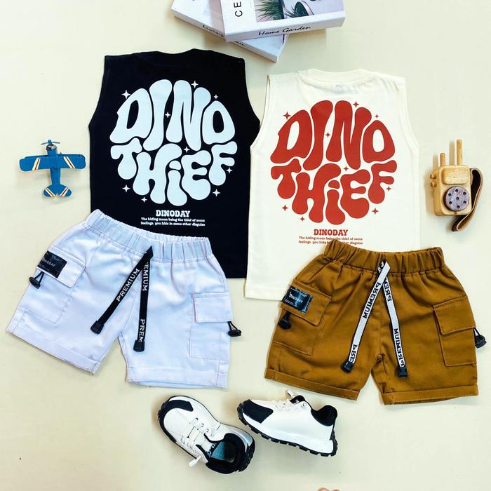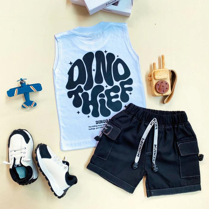 Estishop X Dinoday Stelan Baju Anak Laki Laki Kaos Kutung Singlet Celana Cargo Premium Usia 1-9 Tahun - Kaos Hitam, S