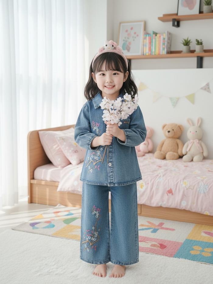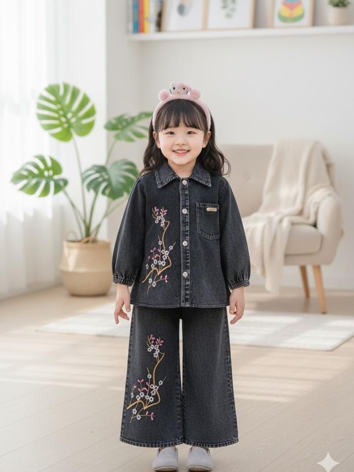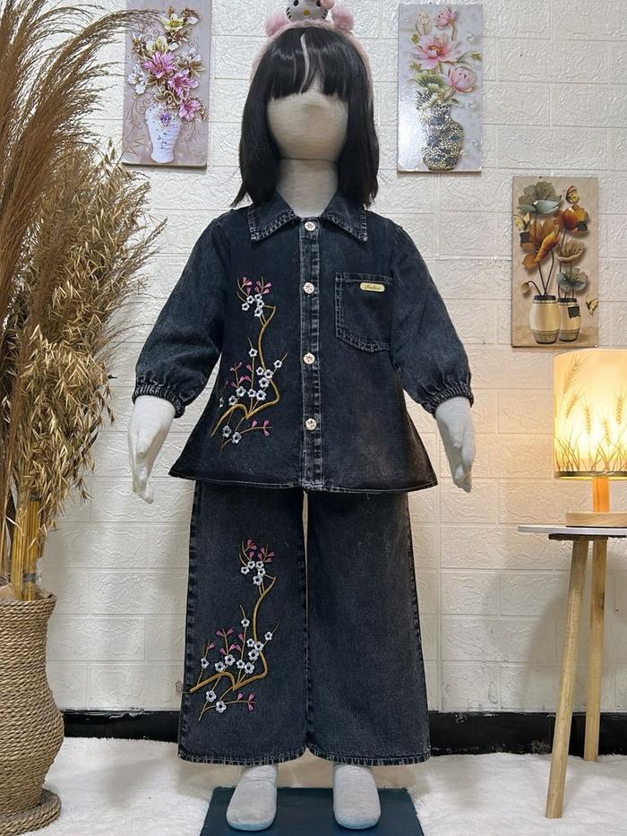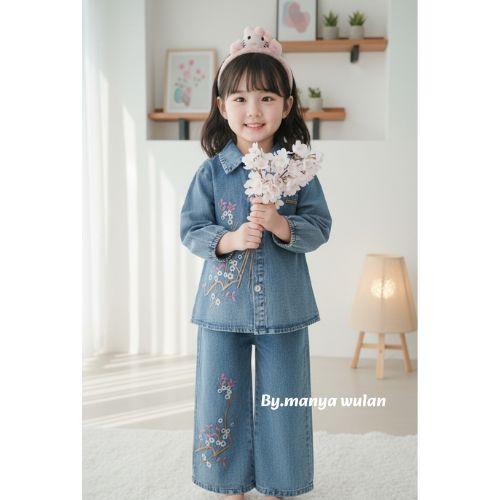 Karamoy Set Jeans Bordir Bunga Anak Perempuan Usia 3 - 10 Tahun / Setelan Viral Model Kekinian - Setcel Full Jeans Model