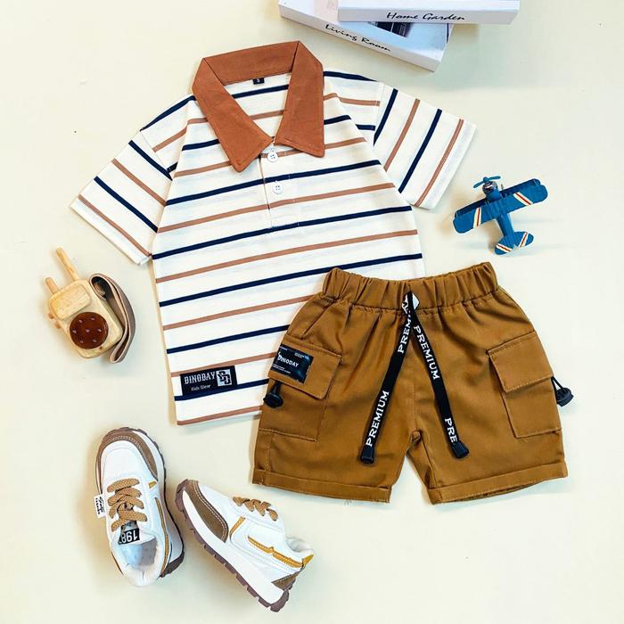 Estishop X Dinoday Setelan Anak Laki Laki Perempuan Baju Kerah Salur Celana Jeans Pendek 1-7 Tahun - Threetone Cargo, S