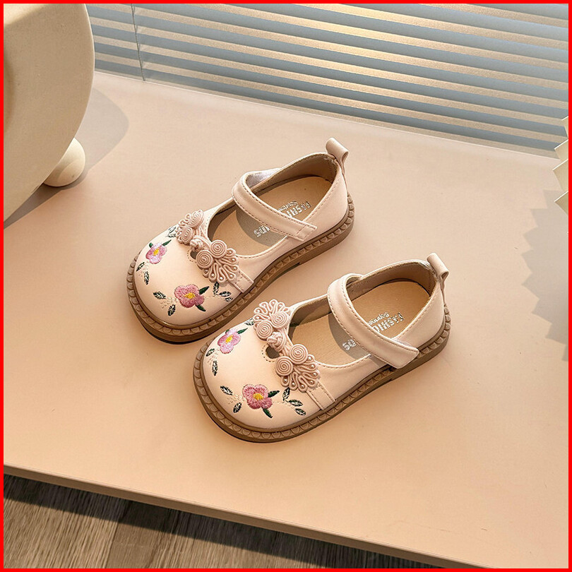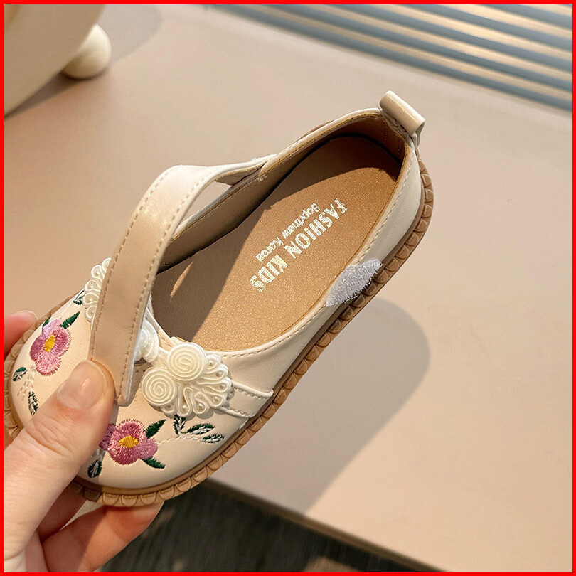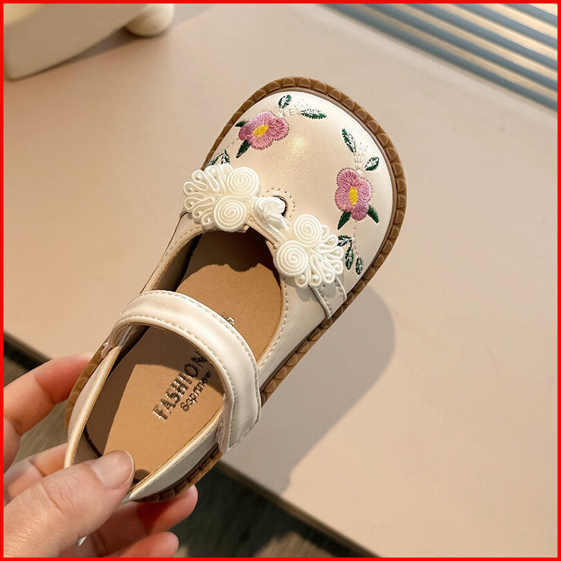 Sepatu Datar Kulit Bayi Perempuan Bunga Bordir Gaya Kuno Sepatu Anak-anak Antilicin Sol Lembut Ujung Bulat Gaya Korea 2-