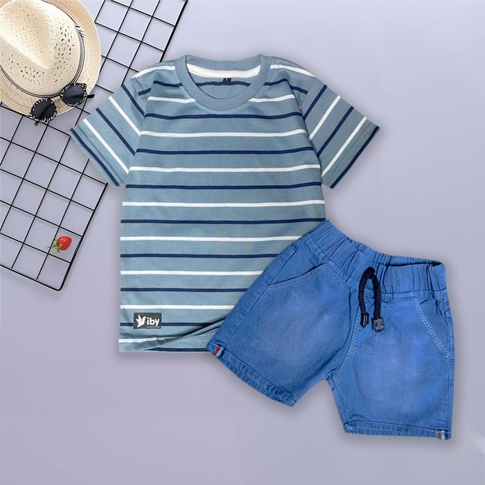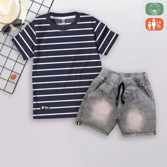Setelan Jeans Kaos Salur/Stripe Bahan Katun/ Setelan Anak - Set Jens Salur Biegi, S