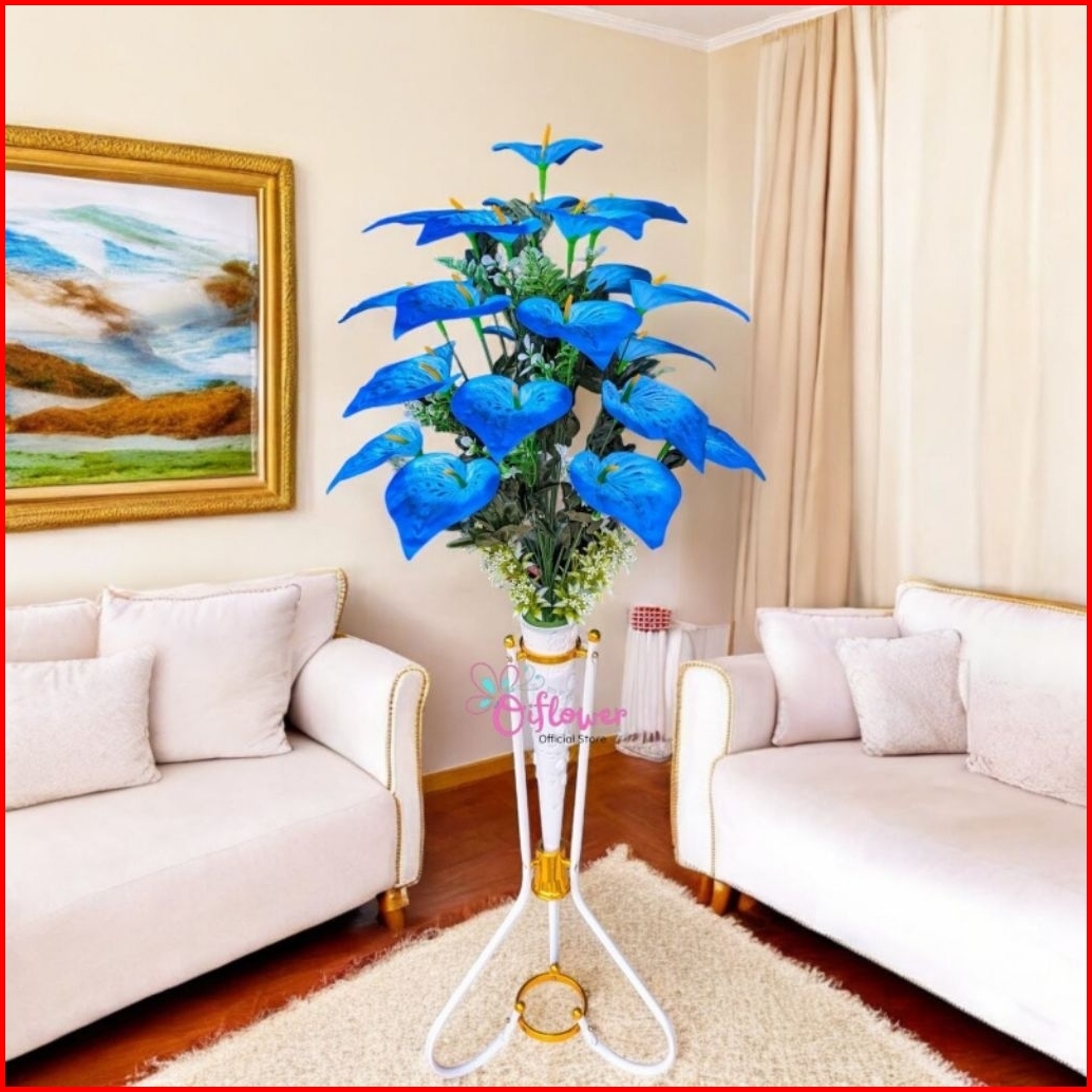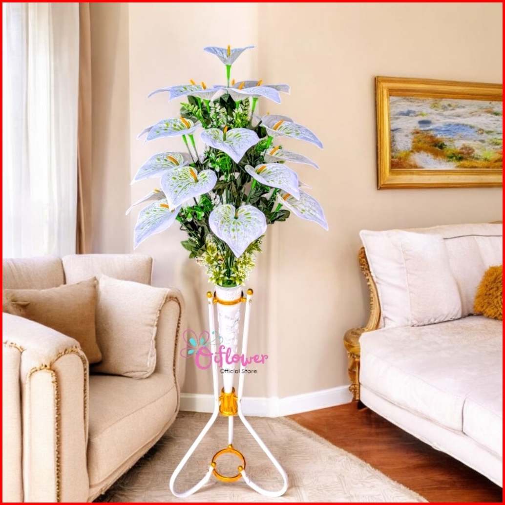 Bunga Hias Artificial Anthurium Panda 18.kuntum Satu Set Lengkap Dengan Vas Standing Besi Hiasan Dekorasi Sudut Ruangan