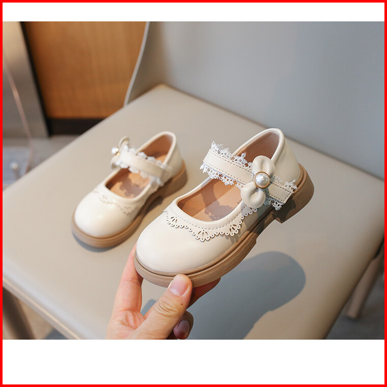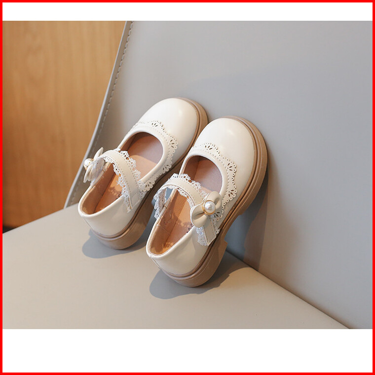 Sepatu Flat Kulit Renda Sederhana Untuk Bayi Perempuan Mutiara Pita Anti-selip Sol Lembut Sepatu Putri Anak-anak Ukuran