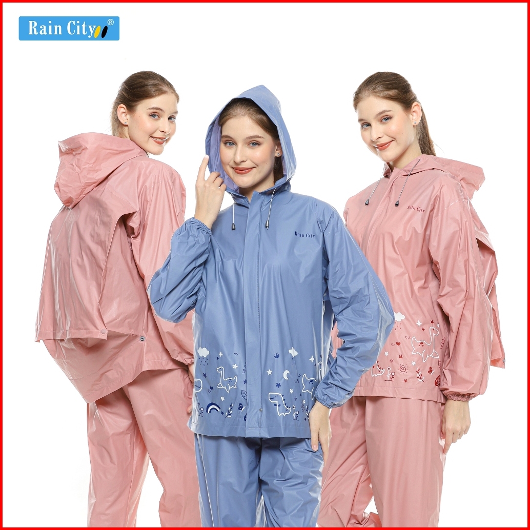 Rain City Jas Hujan Setelan Wanita Ransel Pink Pastel Lucu Dino Doodle 70047 - Pvc Anti Rembes