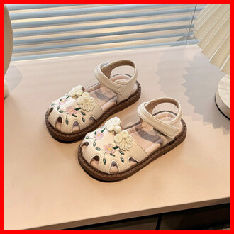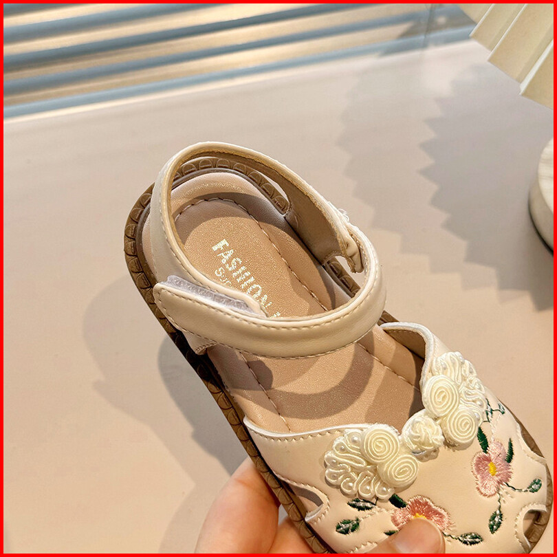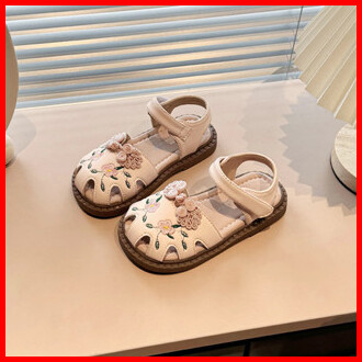 Sandal Kulit Bayi Perempuan Bunga Bordir Sepatu Anak Antilicin Sol Lembut Ikatan Simpul Kuno Ukuran 21-34