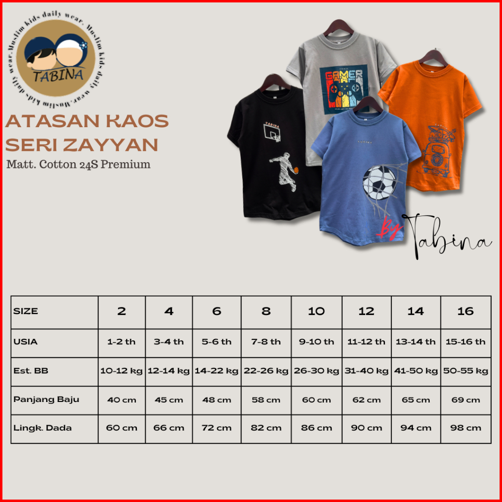 Tabina Atasan Kaos Anak Laki Laki Dan Remaja Lengan Pendek Seri Zayyan Usia 2 Sampai 16 Tahun