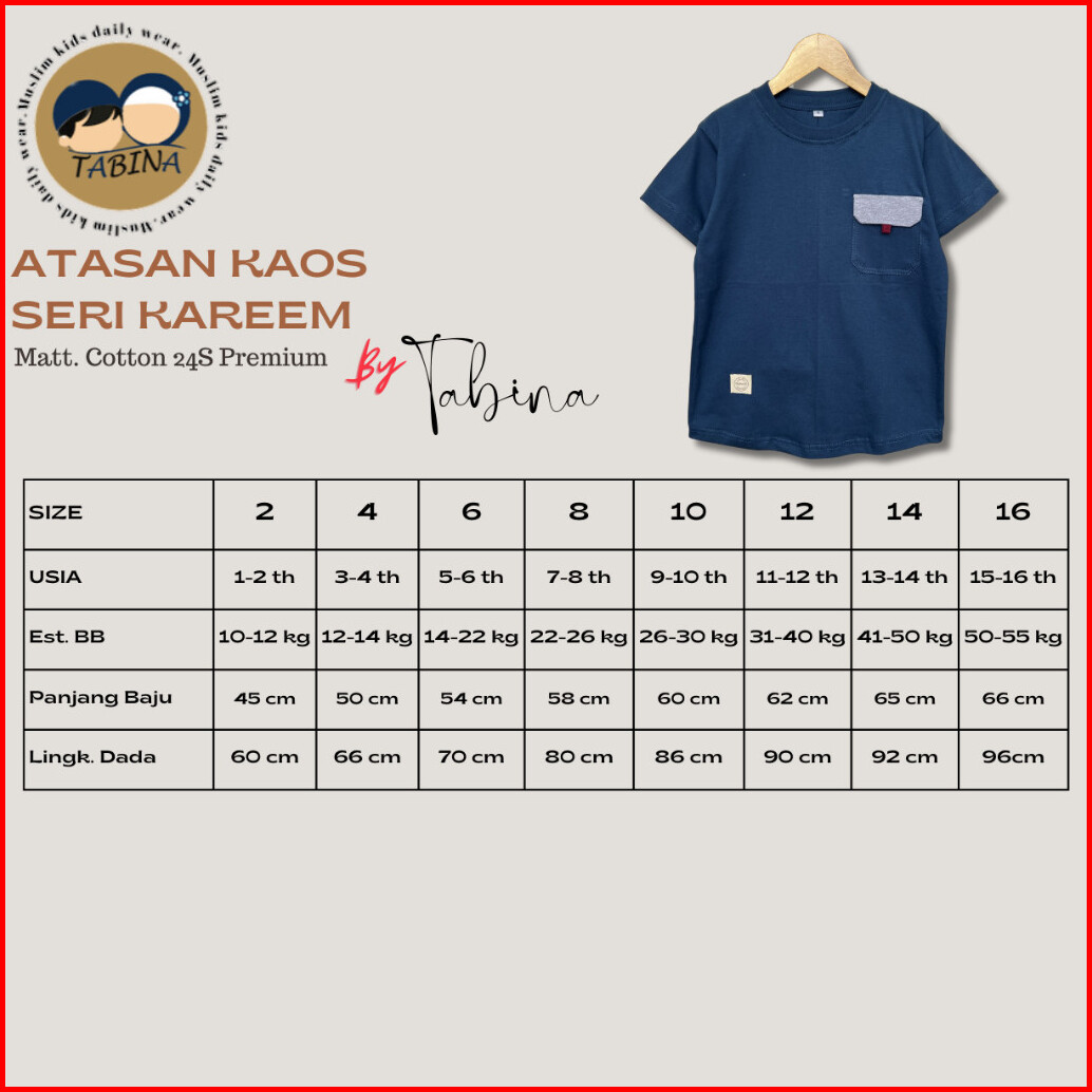 Tabina Kaos Saku Pocket Tee Kurta Anak Laki Laki Dan Remaja Seri Kareem Usia 2 Hingga 16 Tahun