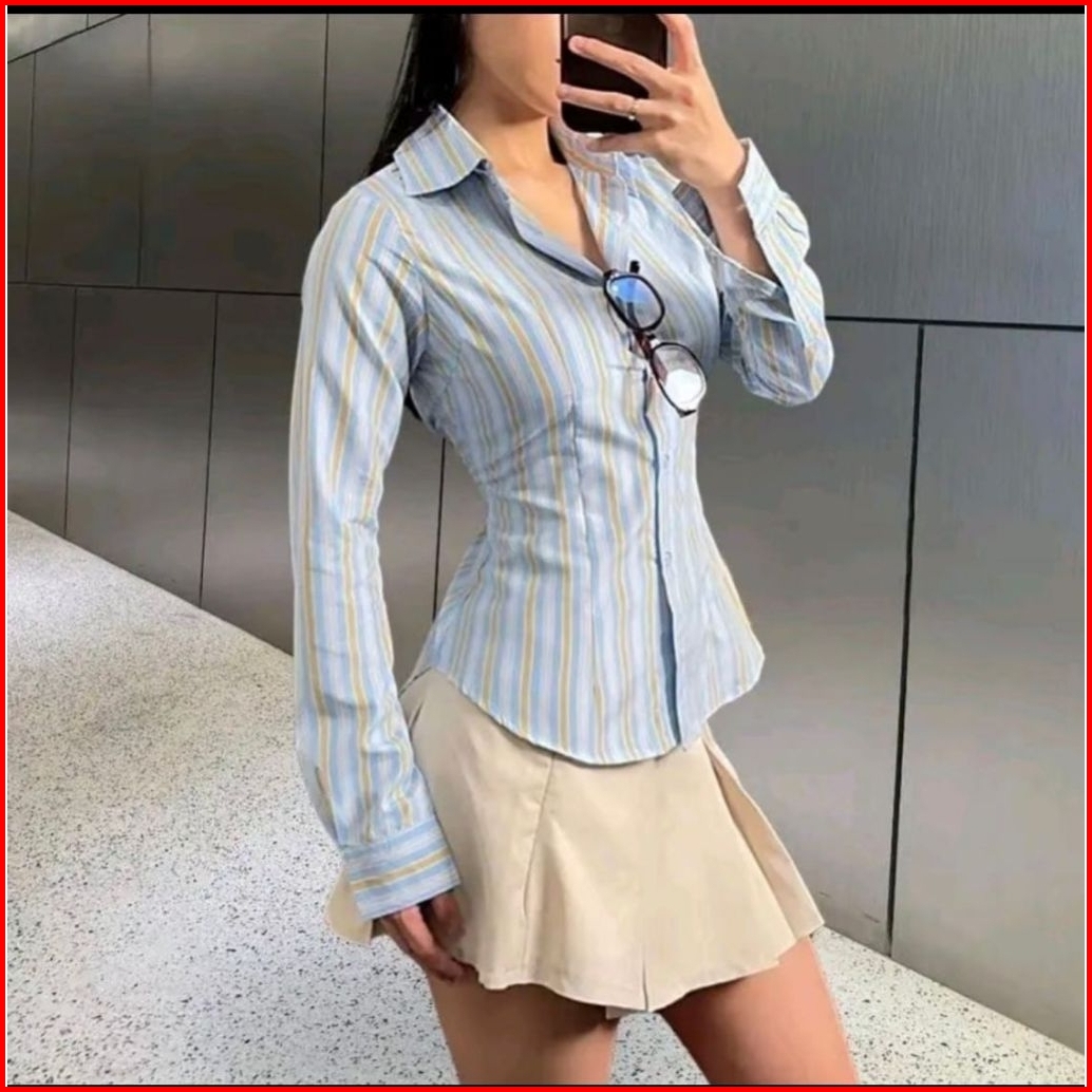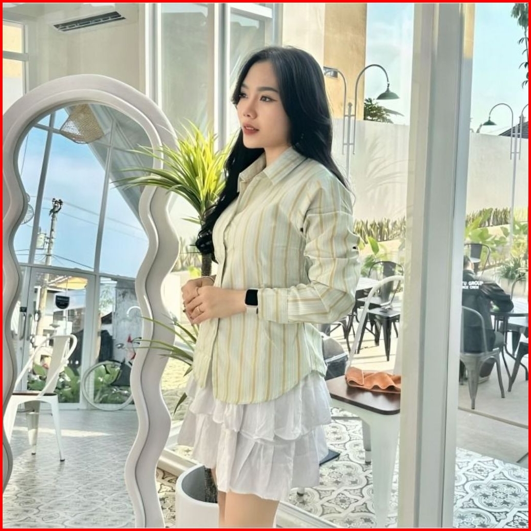 Monney Fitted Shirt Kemeja Slim Motif Stripe Kemeja Kerja Wanita Fit Garis Stripe Karet Lembut Pink Hijau Biru